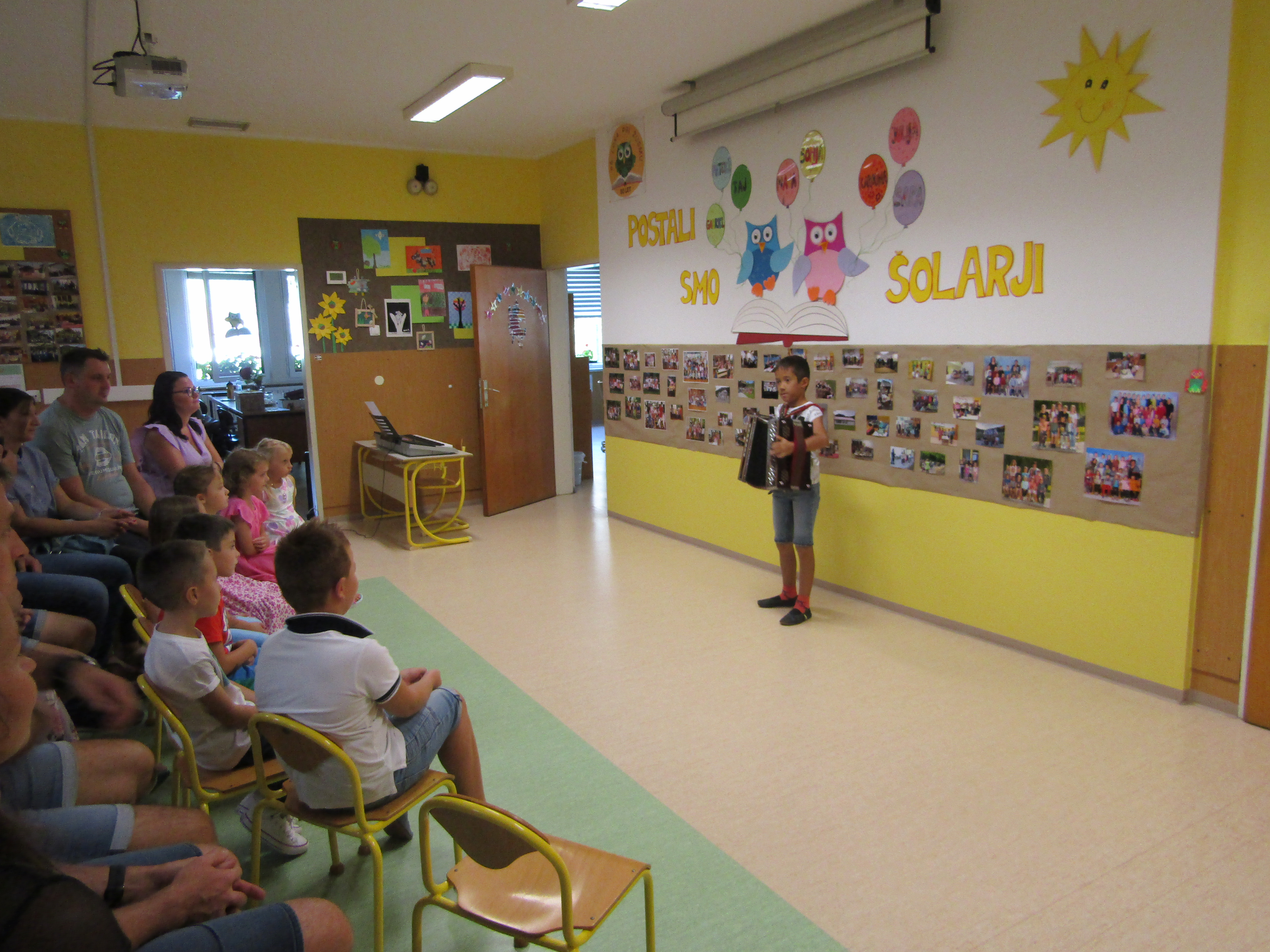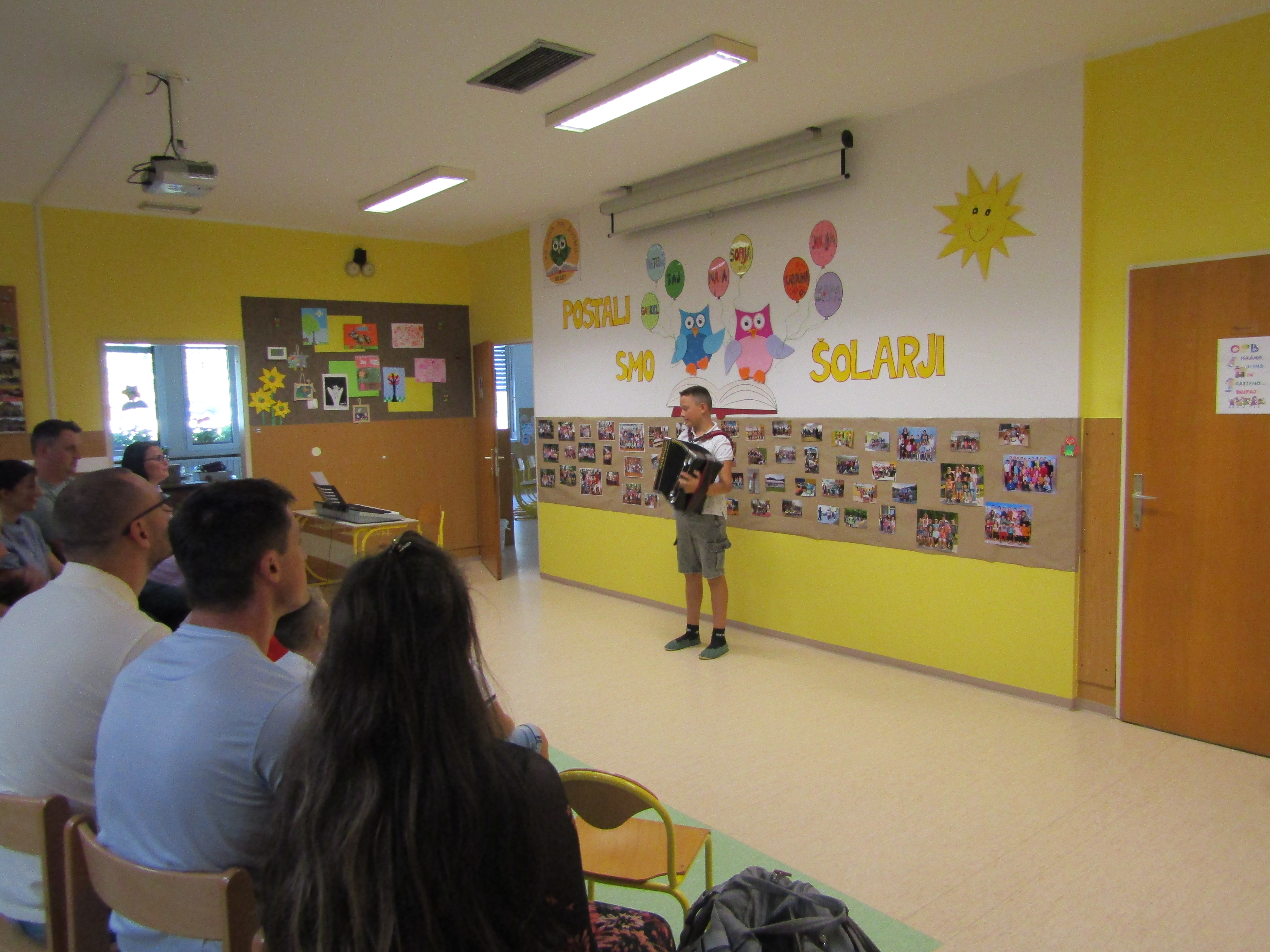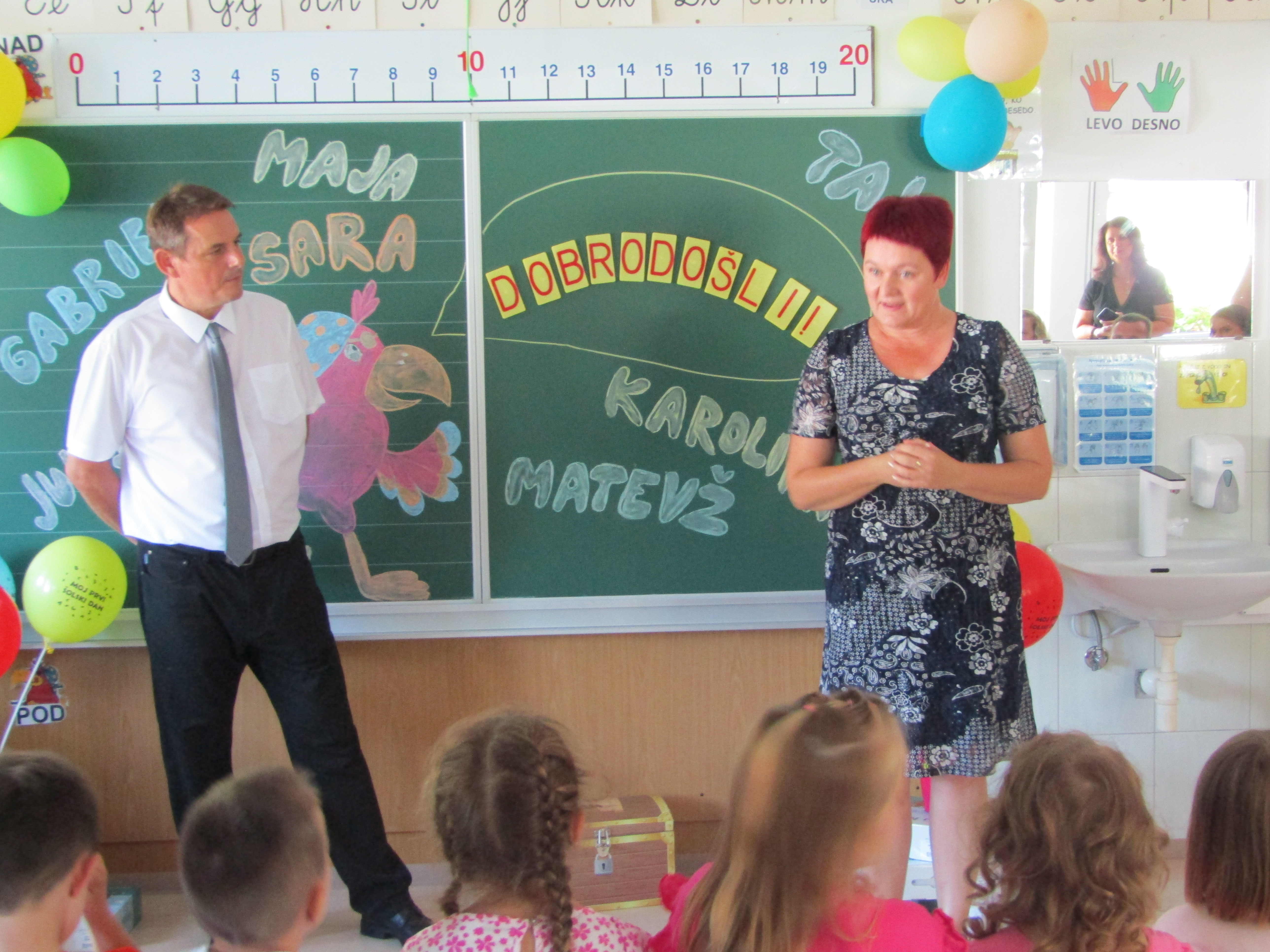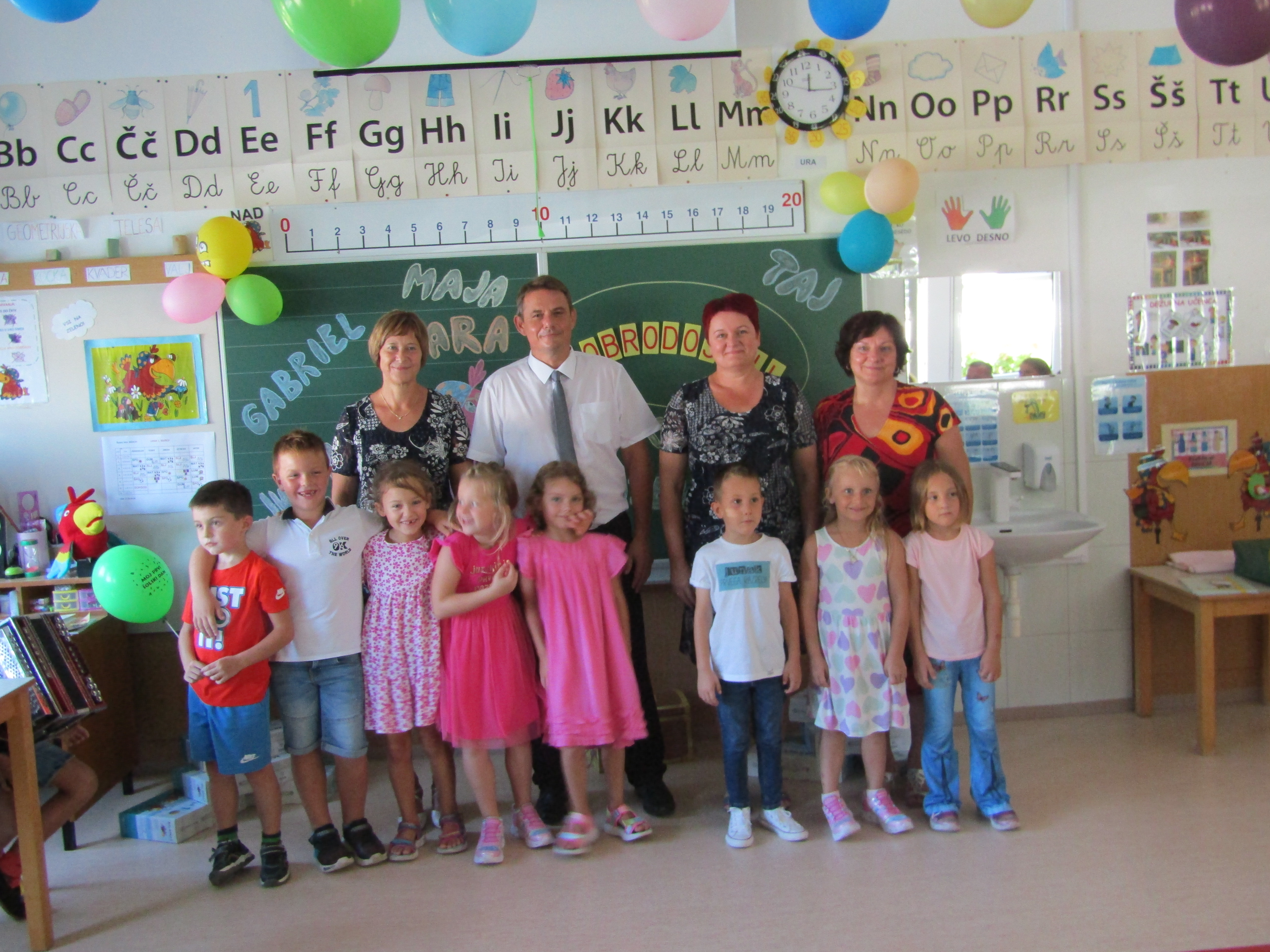 Na 1. šolski dan smo danes, 2. septembra pred šolo učenci in učiteljice veselo pričakali 8 prvošolcev z njihovimi starši. Ob Vallovem igranju na harmoniko so prvošolci v spremstvu večjih učencev prvič prestopili šolski prag. Njihov pomemben šolski dan so učenci po nagovoru vodje šole Fride Gubenšek popestrili s pestrim kulturnim programom, ki ga je vodila petošolka Zala.