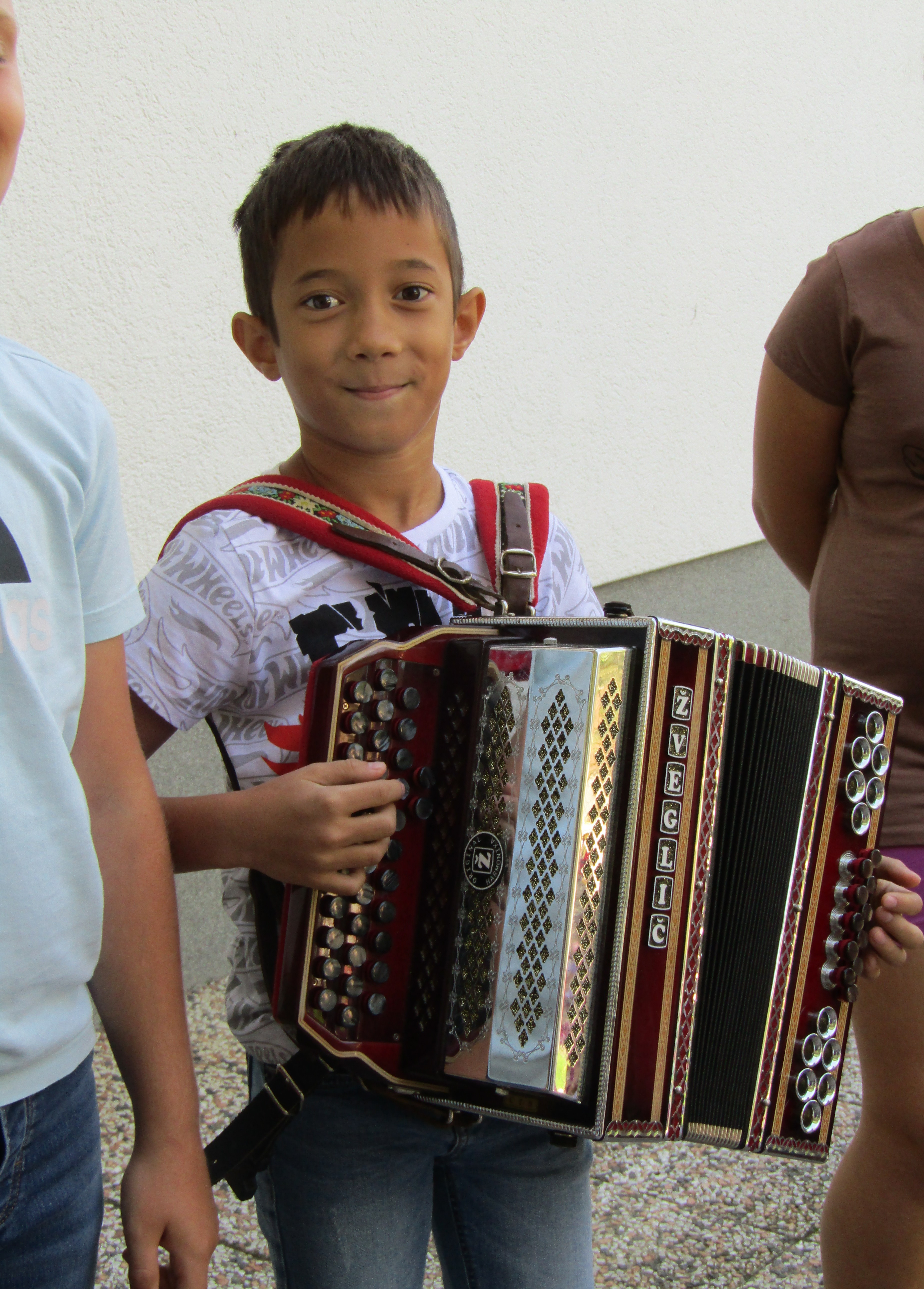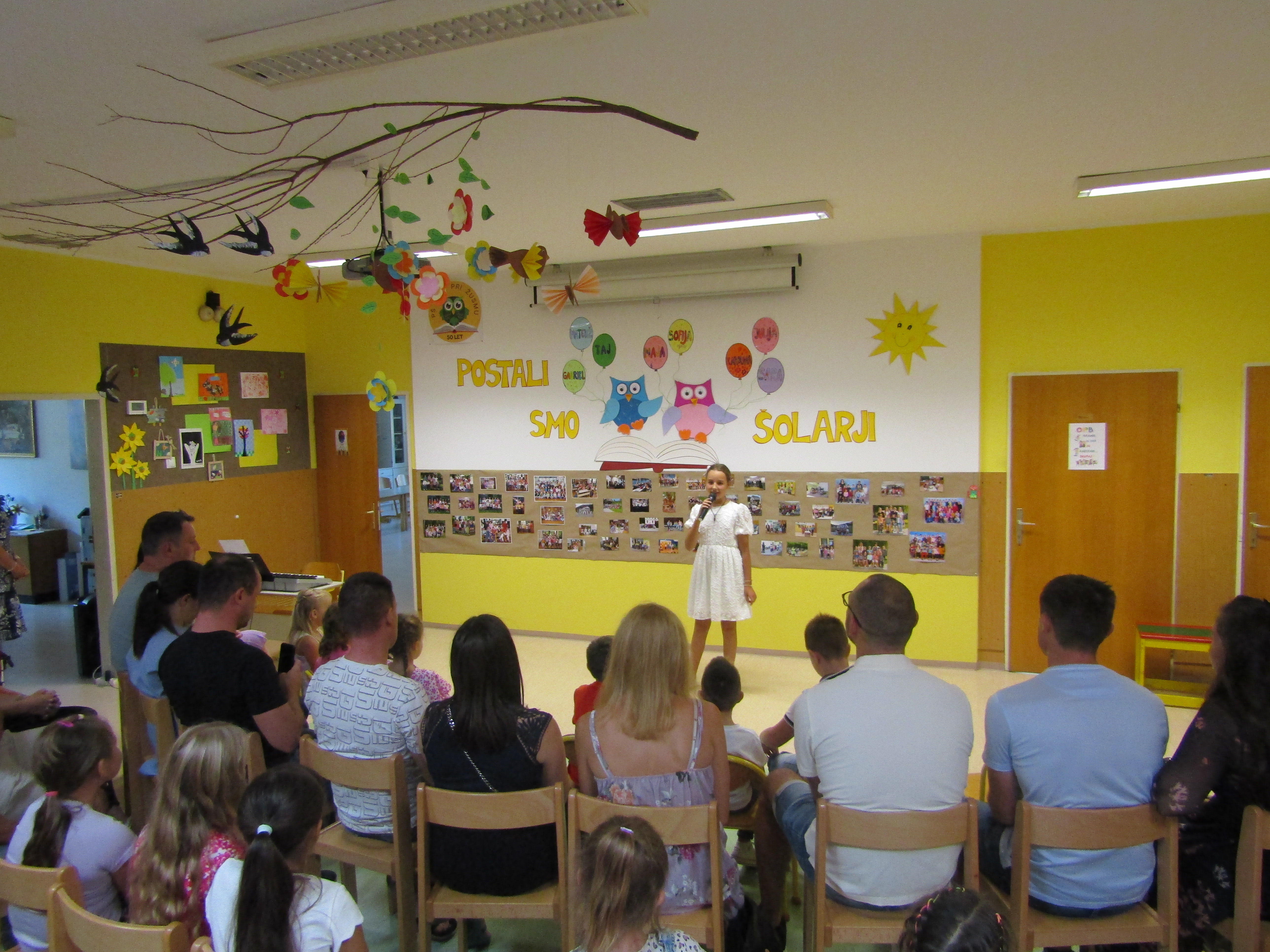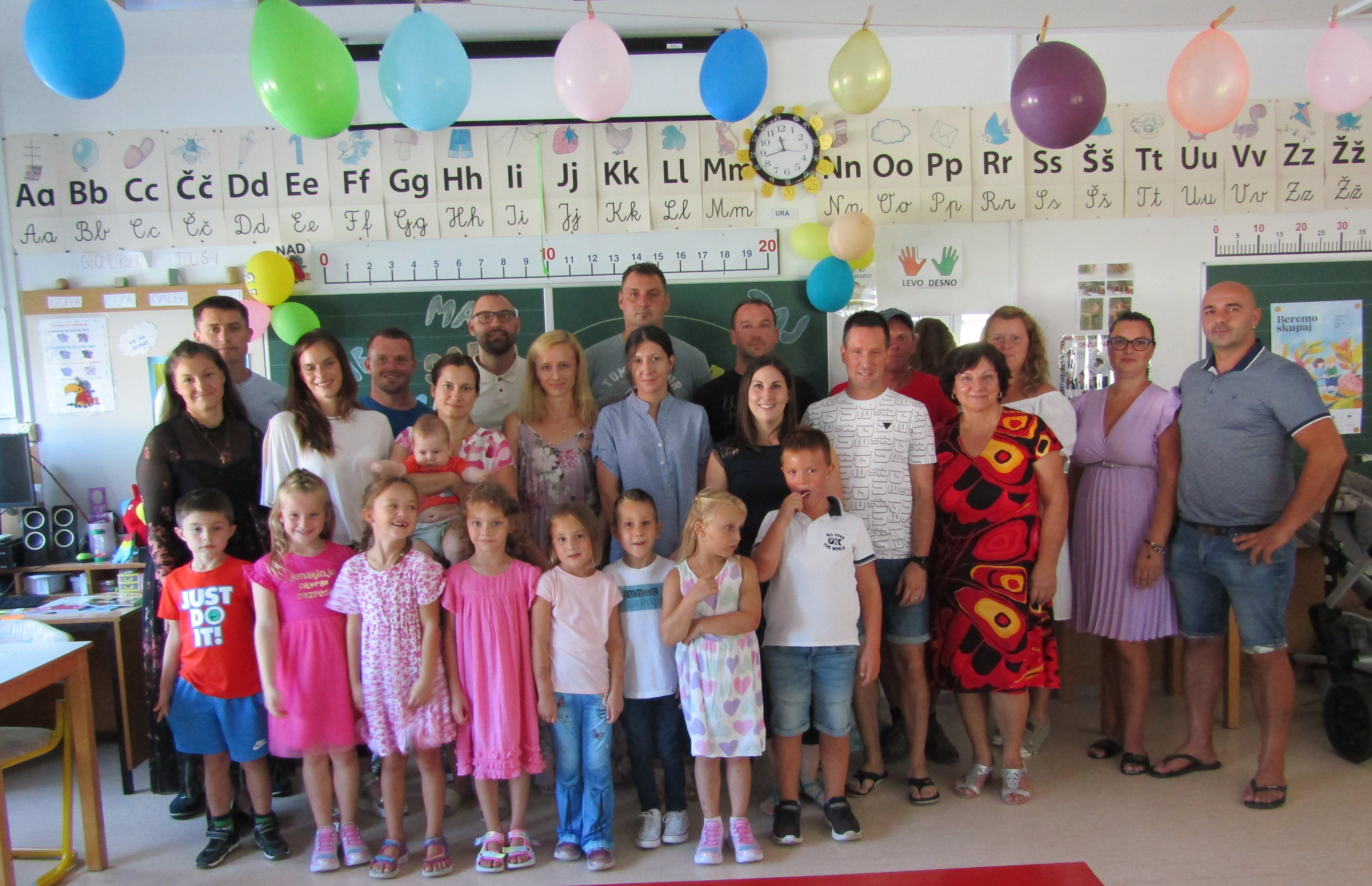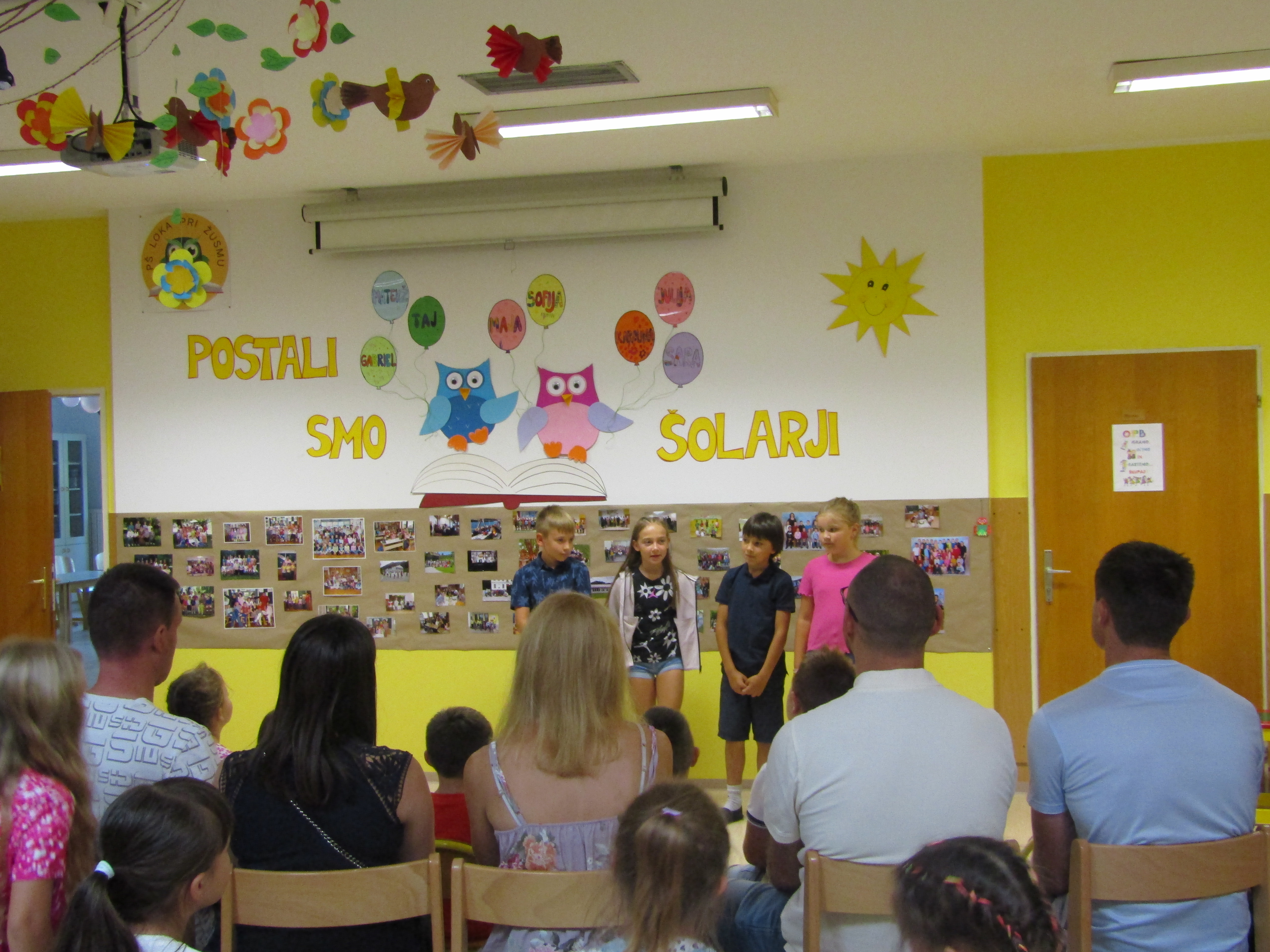 Na 1. šolski dan smo danes, 2. septembra pred šolo učenci in učiteljice veselo pričakali 8 prvošolcev z njihovimi starši. Ob Vallovem igranju na harmoniko so prvošolci v spremstvu večjih učencev prvič prestopili šolski prag. Njihov pomemben šolski dan so učenci po nagovoru vodje šole Fride Gubenšek popestrili s pestrim kulturnim programom, ki ga je vodila petošolka Zala.