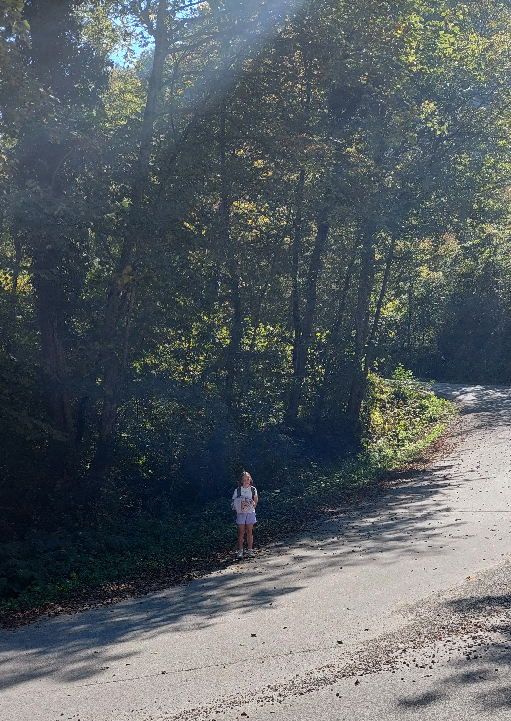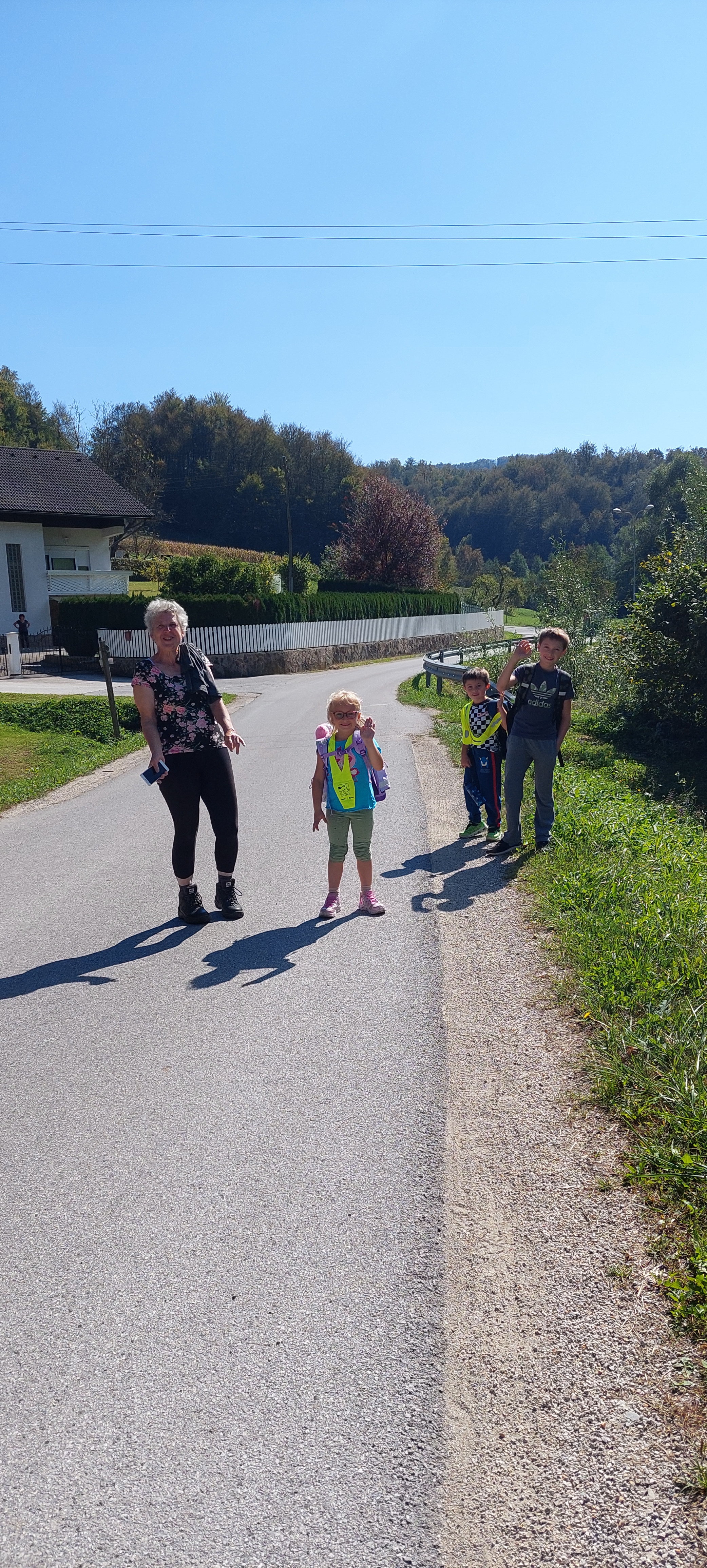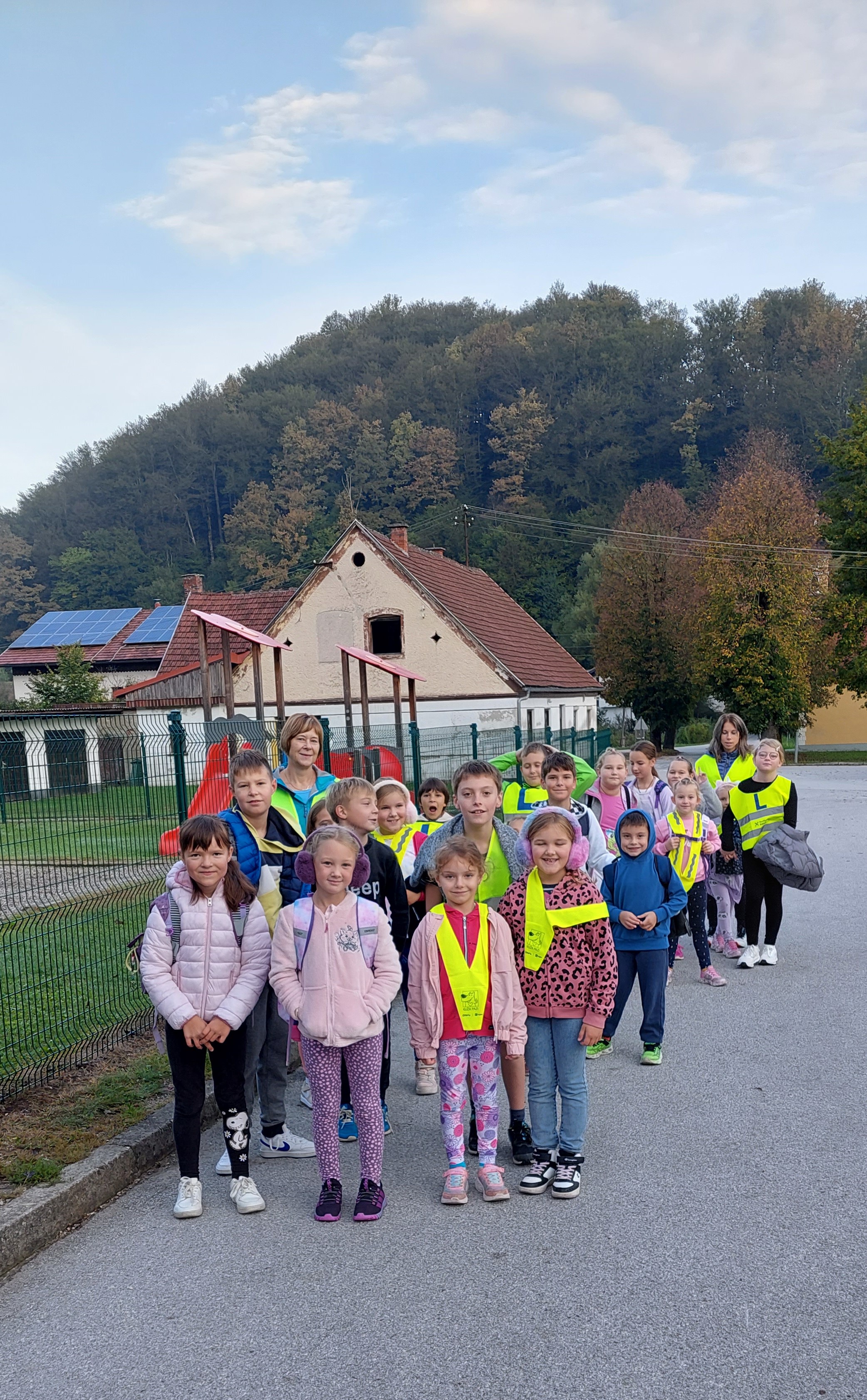 Peš iz šole pa smo se odpravili v ponedeljek, 23. 9. 2024. Po dobrem kosilu smo na ramena obesili malce lažje torbice in se podali na pot. Koliko nas je bilo pogumnežev? Deset ter učiteljici Jasmina in Frida. S hitrimi koraki smo drveli proti Dobrini, po poti pa seveda klepetali, se smejali, uživali na svežem zraku in nihče ni niti pomislil na dolžino poti.
