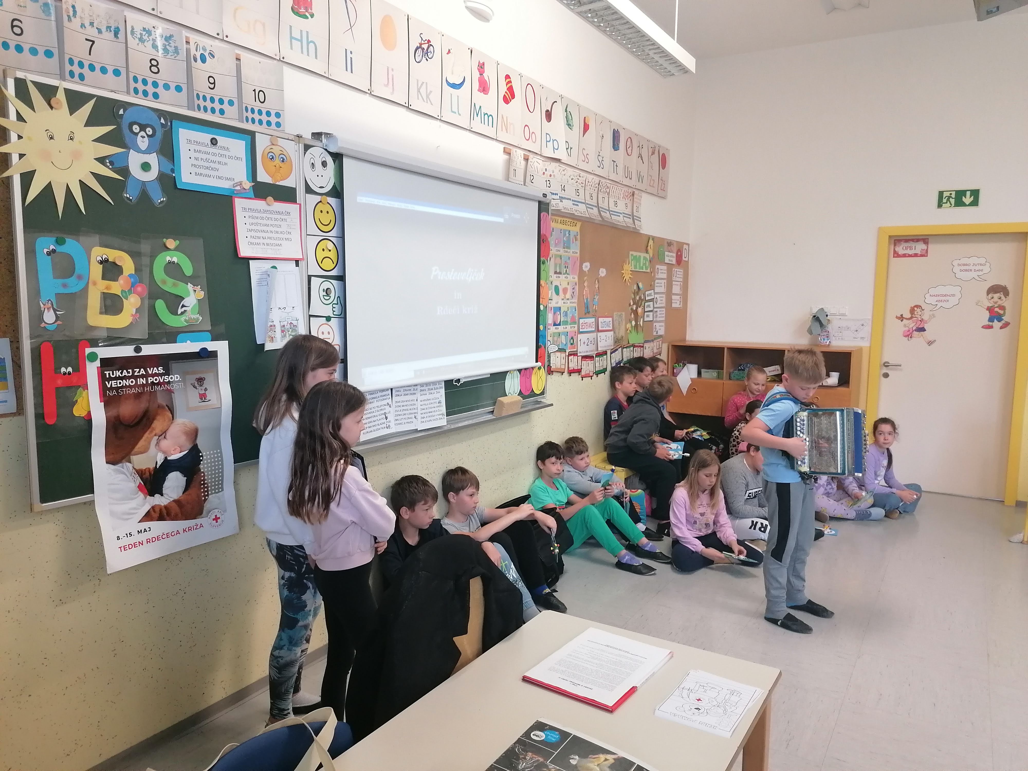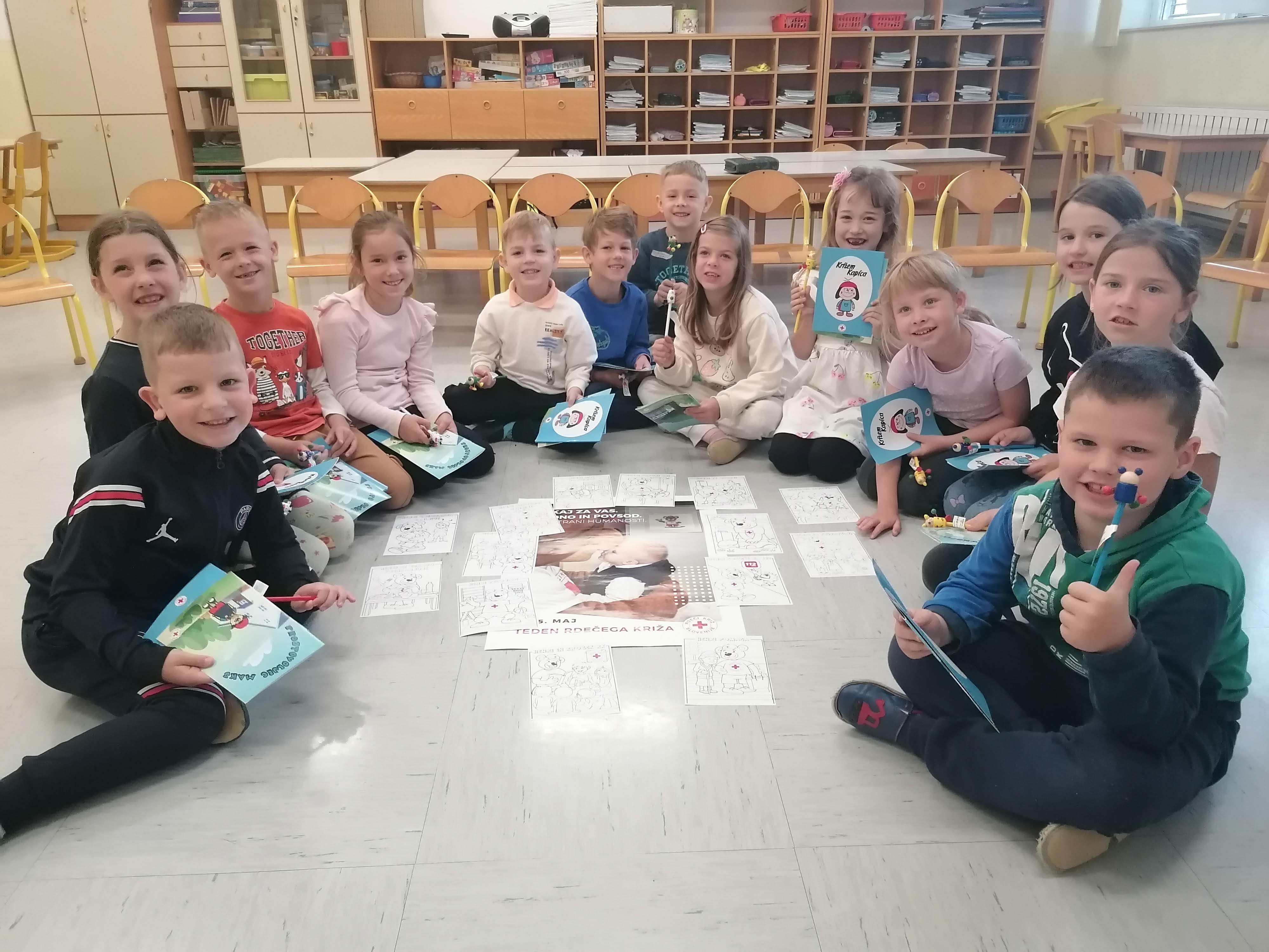 O tednu Rdečega križa in o delovanju humanitarne organizacije so se pogovarjali tudi v 1. razredu. Učenci 4. razreda z razredničarko so jim pripravili kulturni program, jih seznanili z delom organizacije Rdečega križa, jim svetovali, kaj lahko počnejo tudi oni, čeprav so šele prvošolci. V pravljici Medvedek Henry so izvedeli od kod ideja za znak Rdečega križa, s pomočjo risanke pa spoznali načela Rdečega križa. Prvošolci so obljubili, da bodo tudi oni prijateljski, prijazni in dobri. Pazili bodo na čistočo in higieno, predvsem pa, da bodo pridni učenci. Postali so mladi člani Rdečega križa.