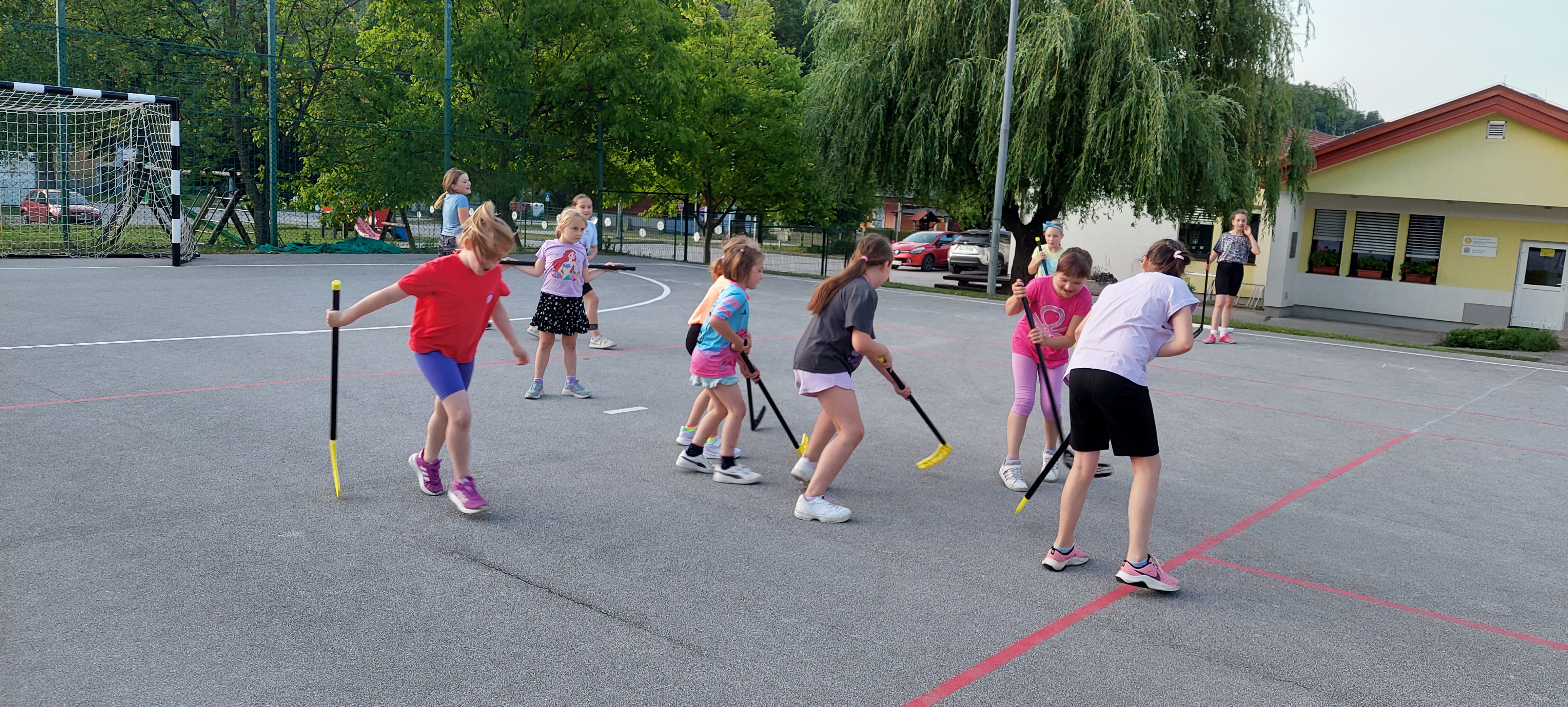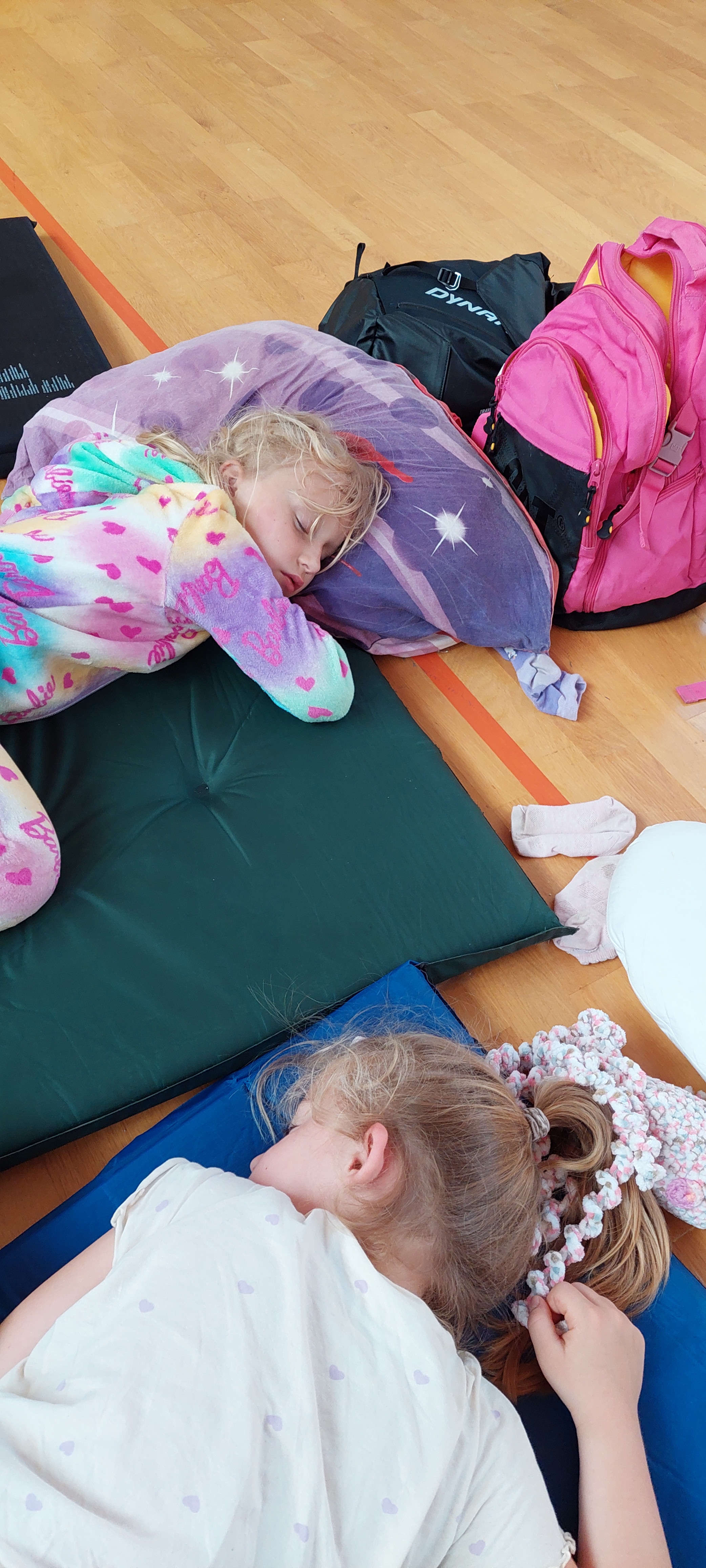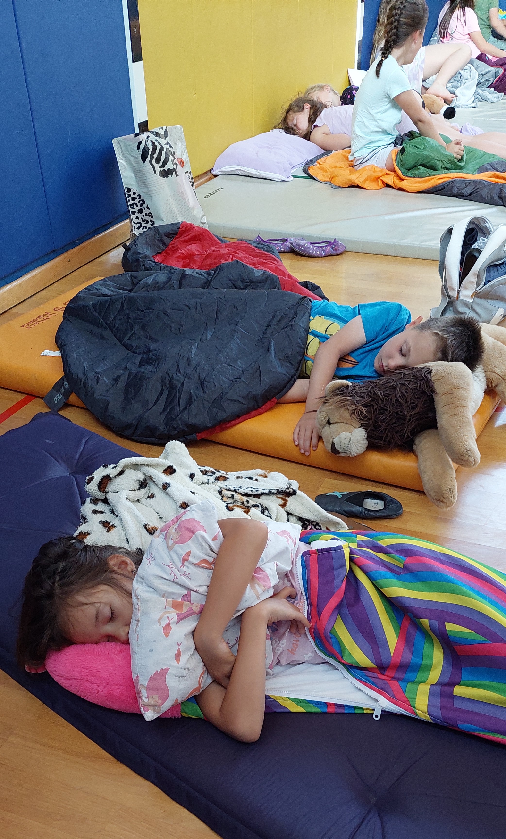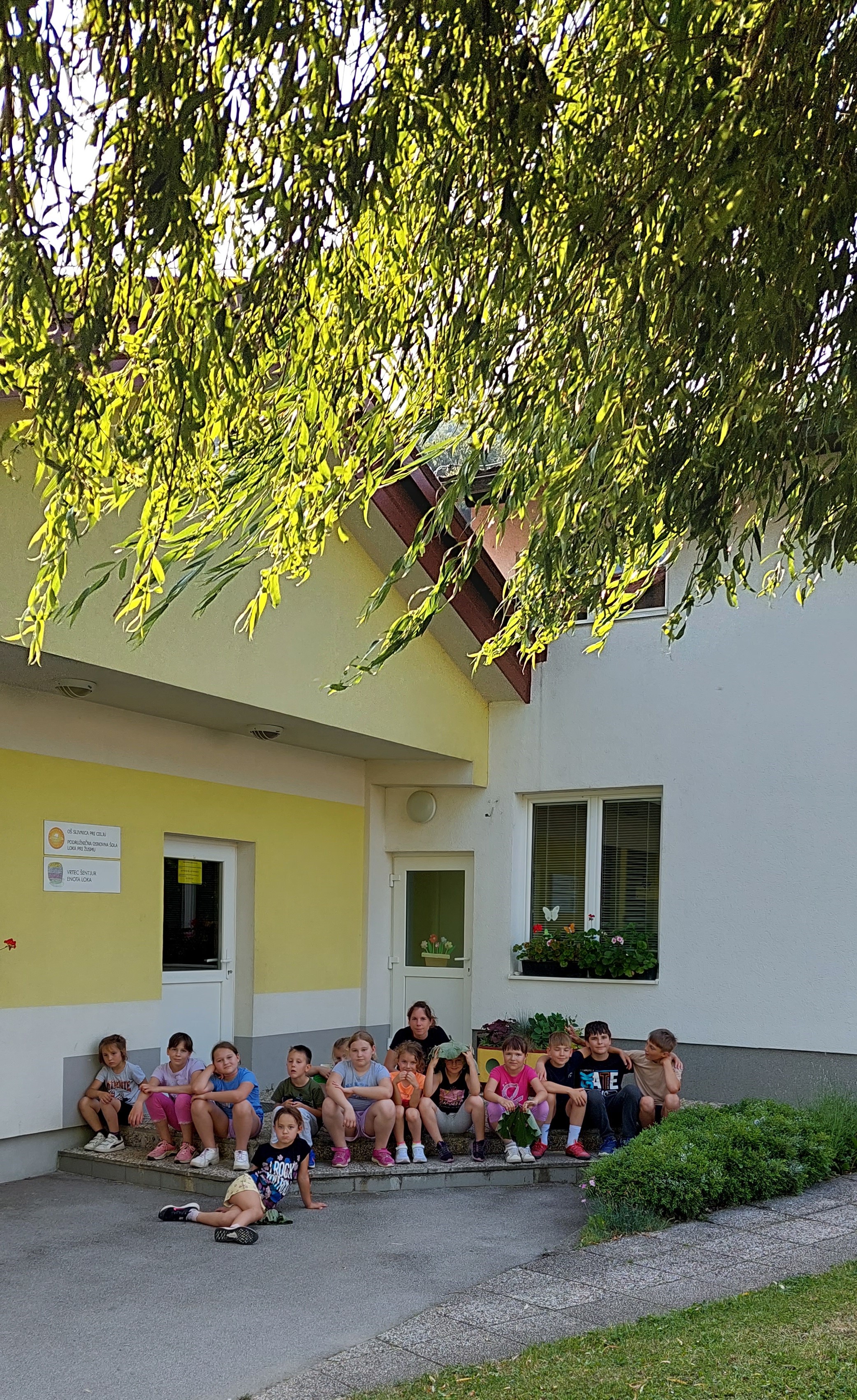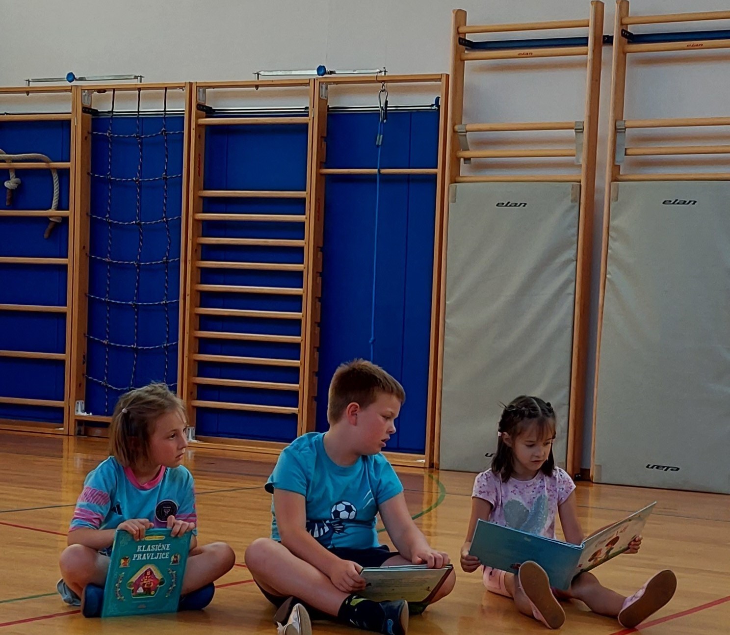 Stvari smo odložili v telovadnico, vzeli knjige in pripovedovanje najljubše pravljice se je pričelo. Sledila je večerja. Palačinke z marmelado so bile slastne, trebuščki polni in potrebna je bila telovadba. Odšli smo na igrišče, kjer smo igrali hokej ter med dvema ognjema. Pričelo se je temniti in odšli smo v jedilnico, kjer smo imeli kino. Uživali smo, a utrujenost je bila po napornem tednu velika, zato smo kaj kmalu odšli v telovadnico in si pripravili ležišča. Poskrbeli smo za osebno higieno, poslušali pravljice ter počasi drug za drugim zaspali.