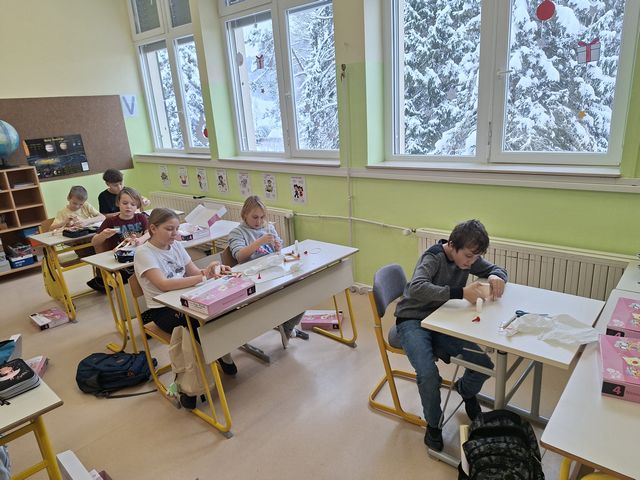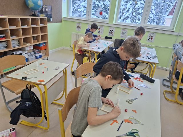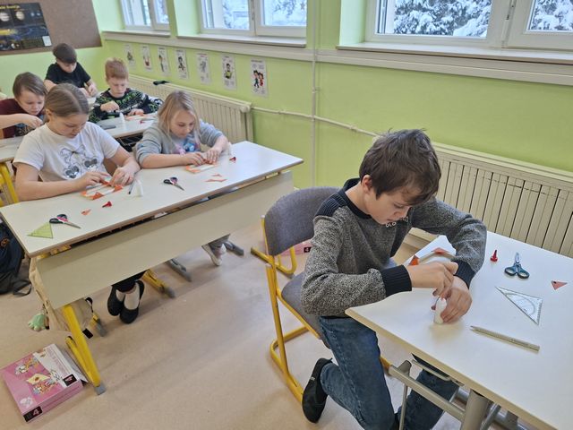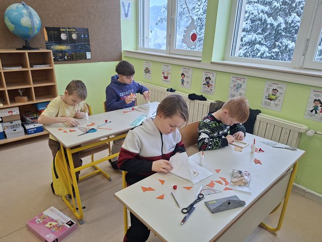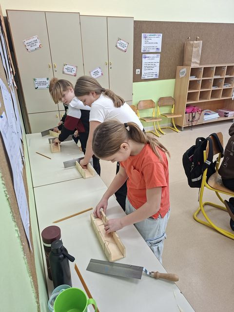 Med delom so učenci spoznavali različna orodja in tehnike. Hitro so ugotovili, da je lepenko z otroškimi škarjami precej težje rezati kot papir. Preizkusili so klešče za luknjanje in kovičenje, s katerimi so najprej naredili luknje, nato pa jih zakovičili. Z ročno žago so morali odžagati letvico –  nekaterim je to šlo kot po maslu, drugi so se morali malo bolj potruditi, a obupal ni nihče. Letvice, ki so jih skrajšali, so nato še pobrusili z brusnim papirjem, da so bile gladke in primerne za lepljenje.