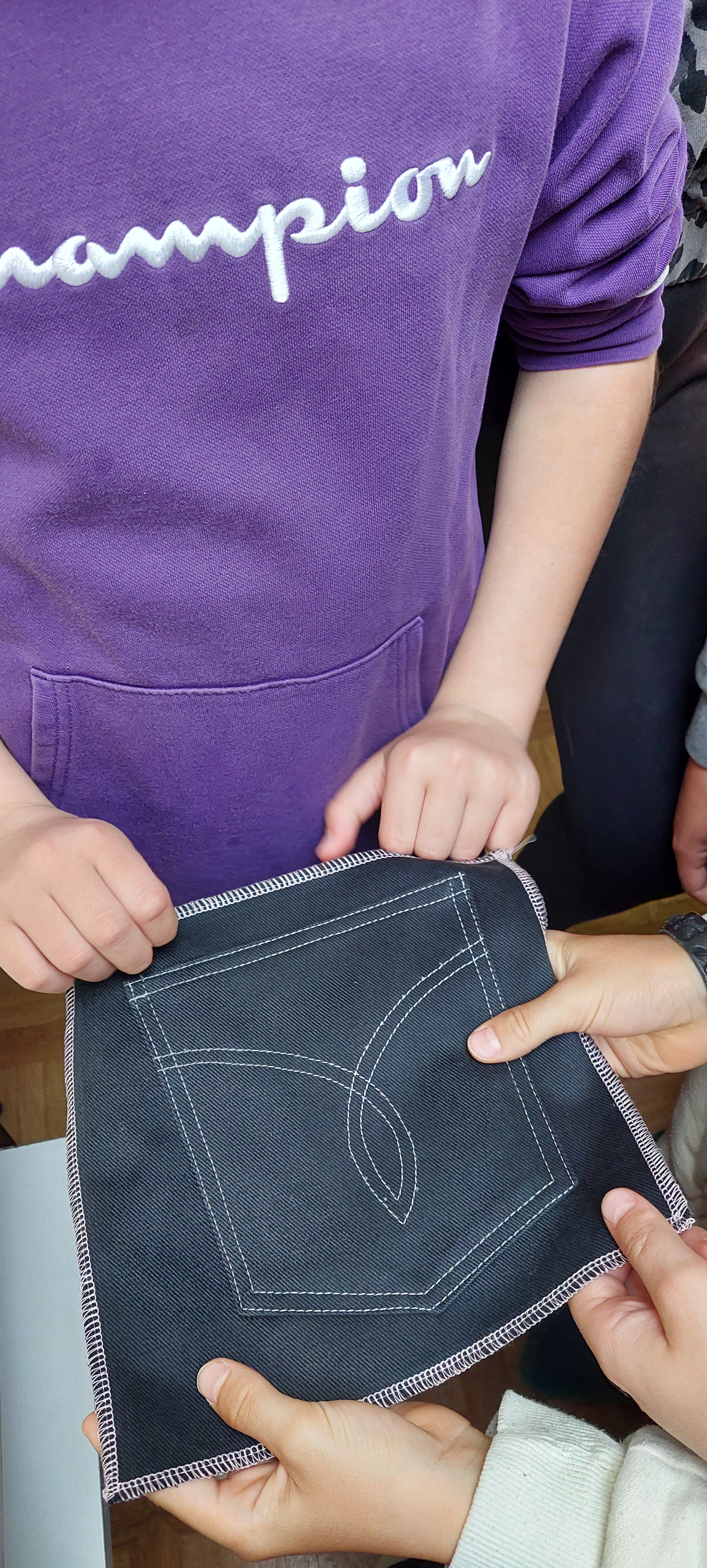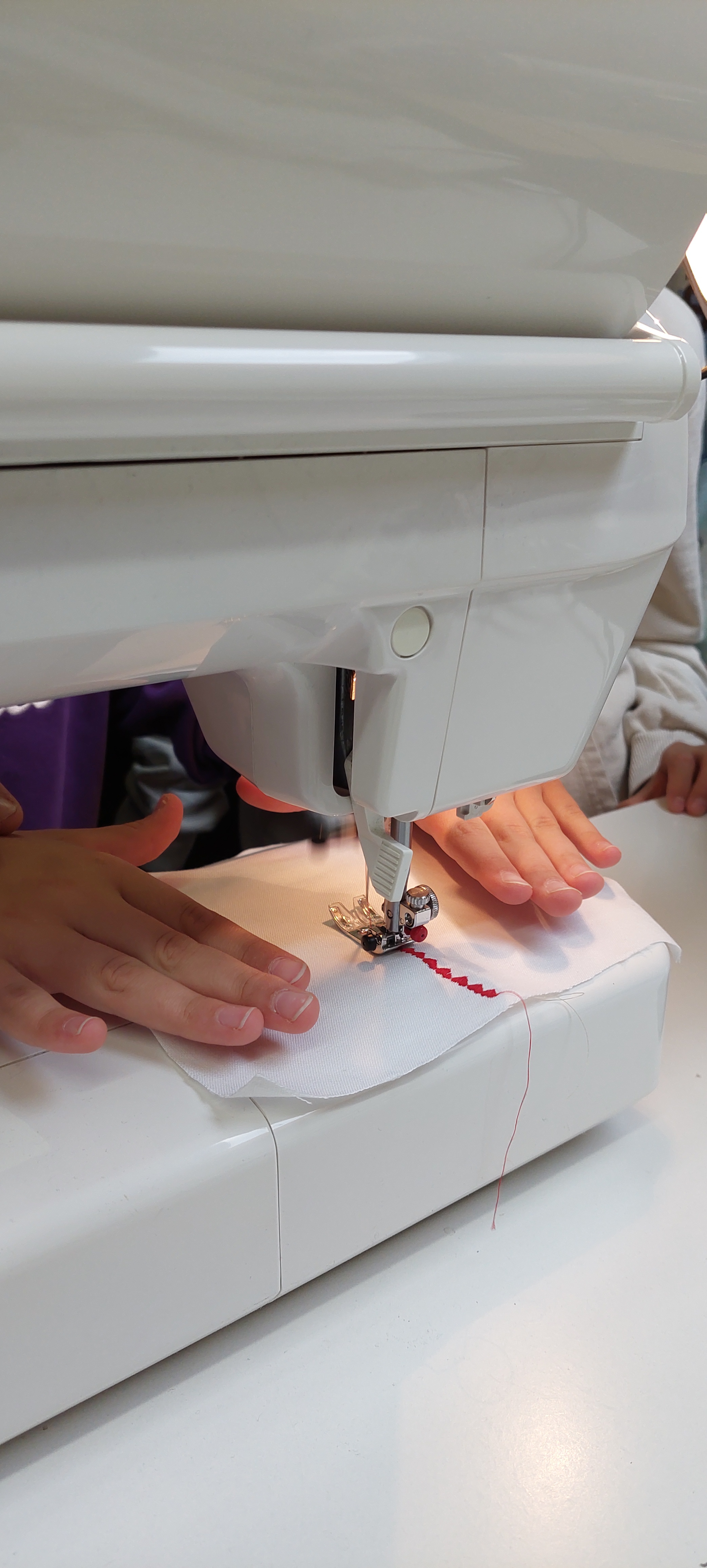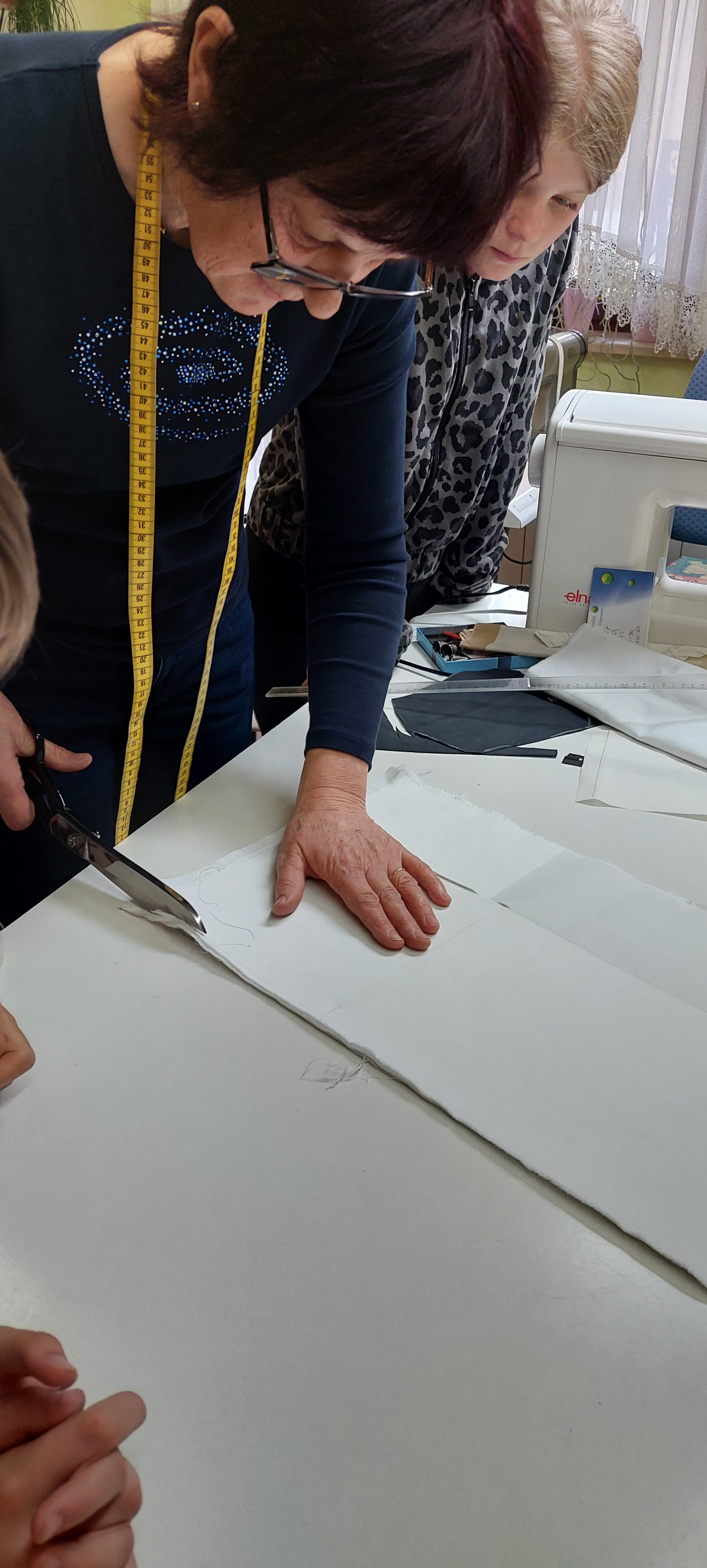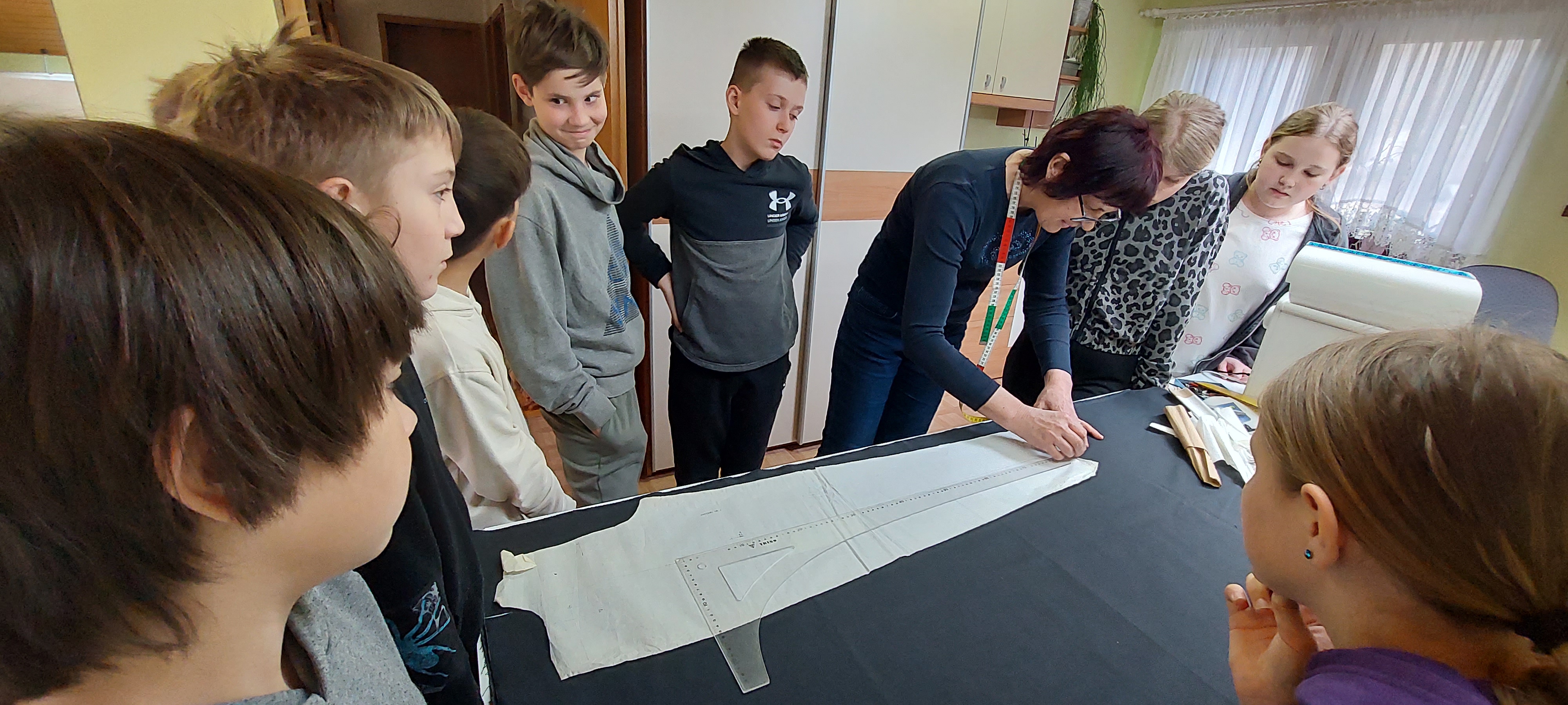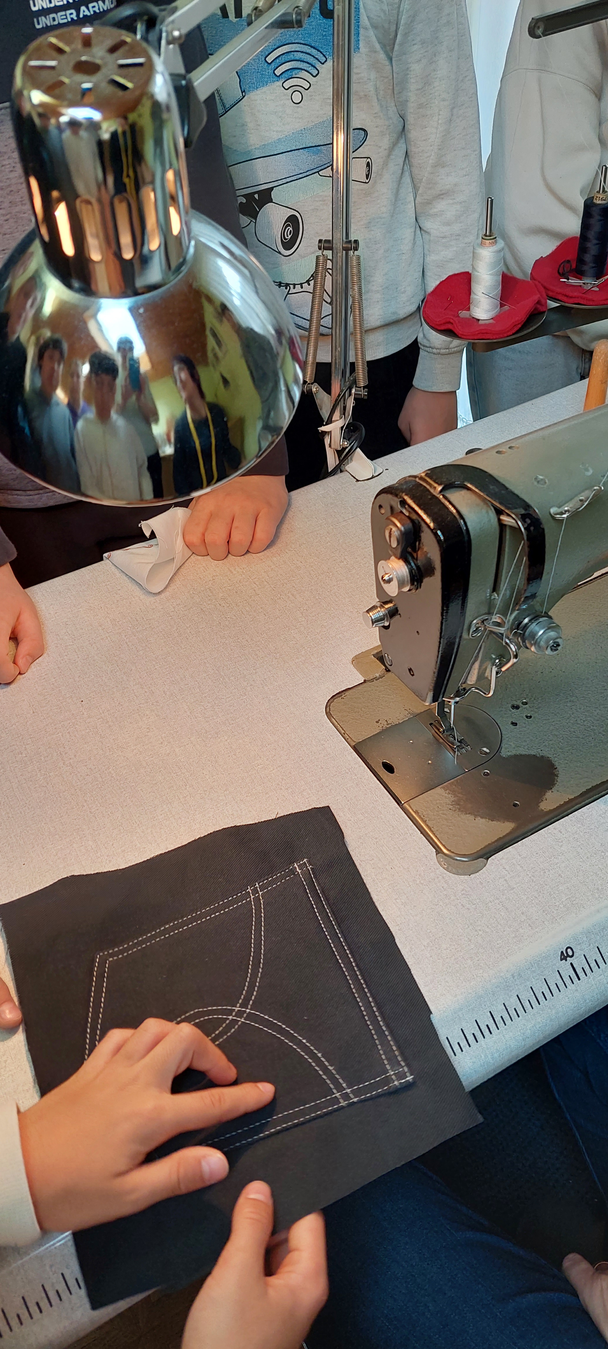 Najprej nam je pokazala različne šivalne stroje in druge pripomočke, ki jih uporablja pri delu. Nato nam je razložila, kako nastanejo hlače. Pripravili smo blago in nanj položili kroj ter ga obrisali s kredo. Vsi smo poskusili rezati tudi s škarjami, ki režejo samo blago. Ugotovili smo, da je to precej težje kot izgleda. Želeli smo narediti različne vzorce s šivalnim strojem. Nekaj nam jih je uspelo naredili, nato pa nas šivalni stroj ni hotel več ubogati. Nitke so se zapletle in šivanja je bilo konec. A šivilja Vida ga bo že popravila! Na koncu je žep na drugem šivalnem stroju sešila še gospa Vida. Bil nam je tako všeč, da smo ga vzeli kar s seboj v šolo.