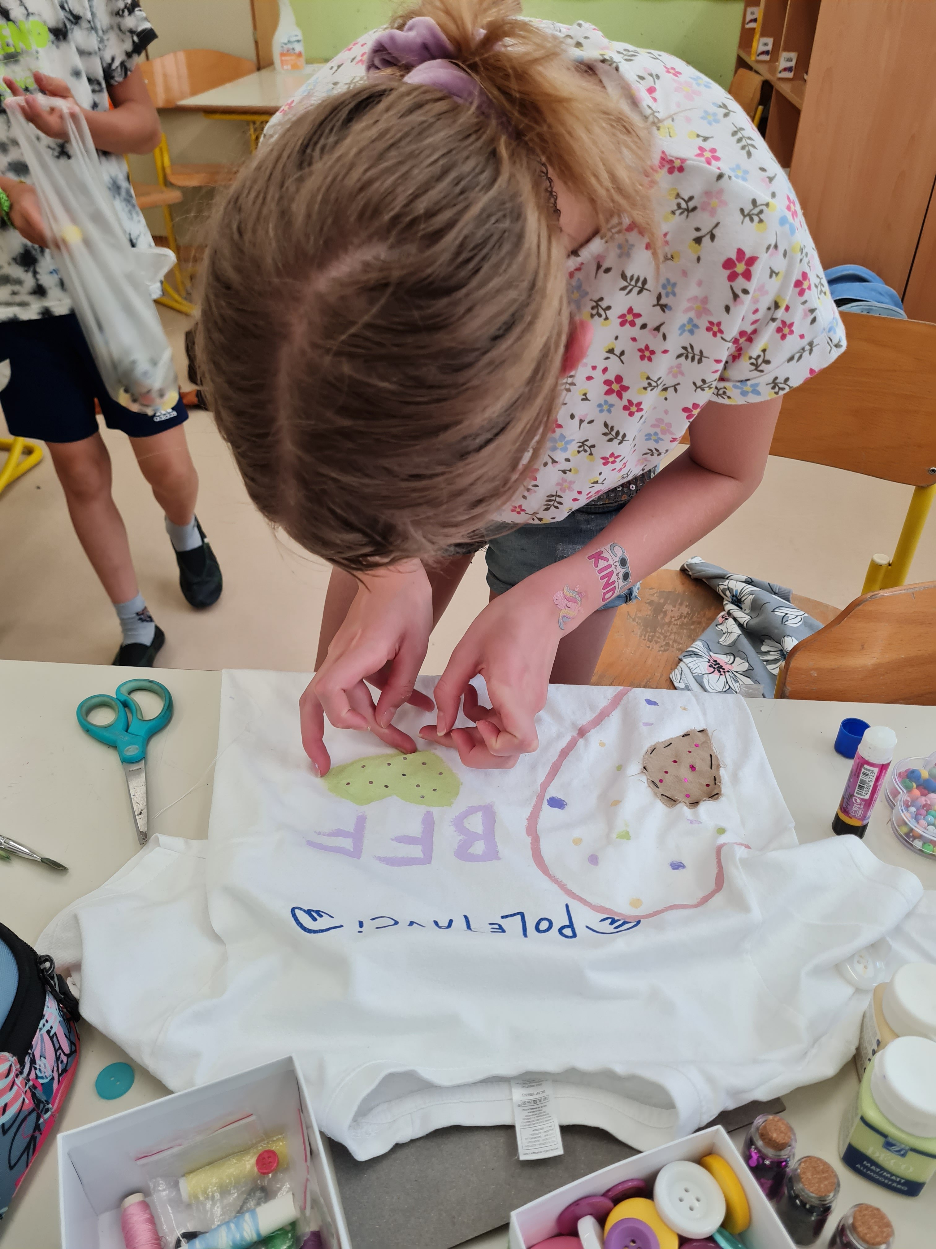 Petošolci matične šole smo minuli petek pri gospodinjstvu plemenitili tekstil. V šolo smo prinesli majice s kratkimi rokavi ter različne tekstilne barve, flomastre, našitke, kose blaga, gumbe vseh vrst in oblik, šiviljske pripomočke … in si izdelali unikatne poletne majice, na katere smo bili zelo ponosni.