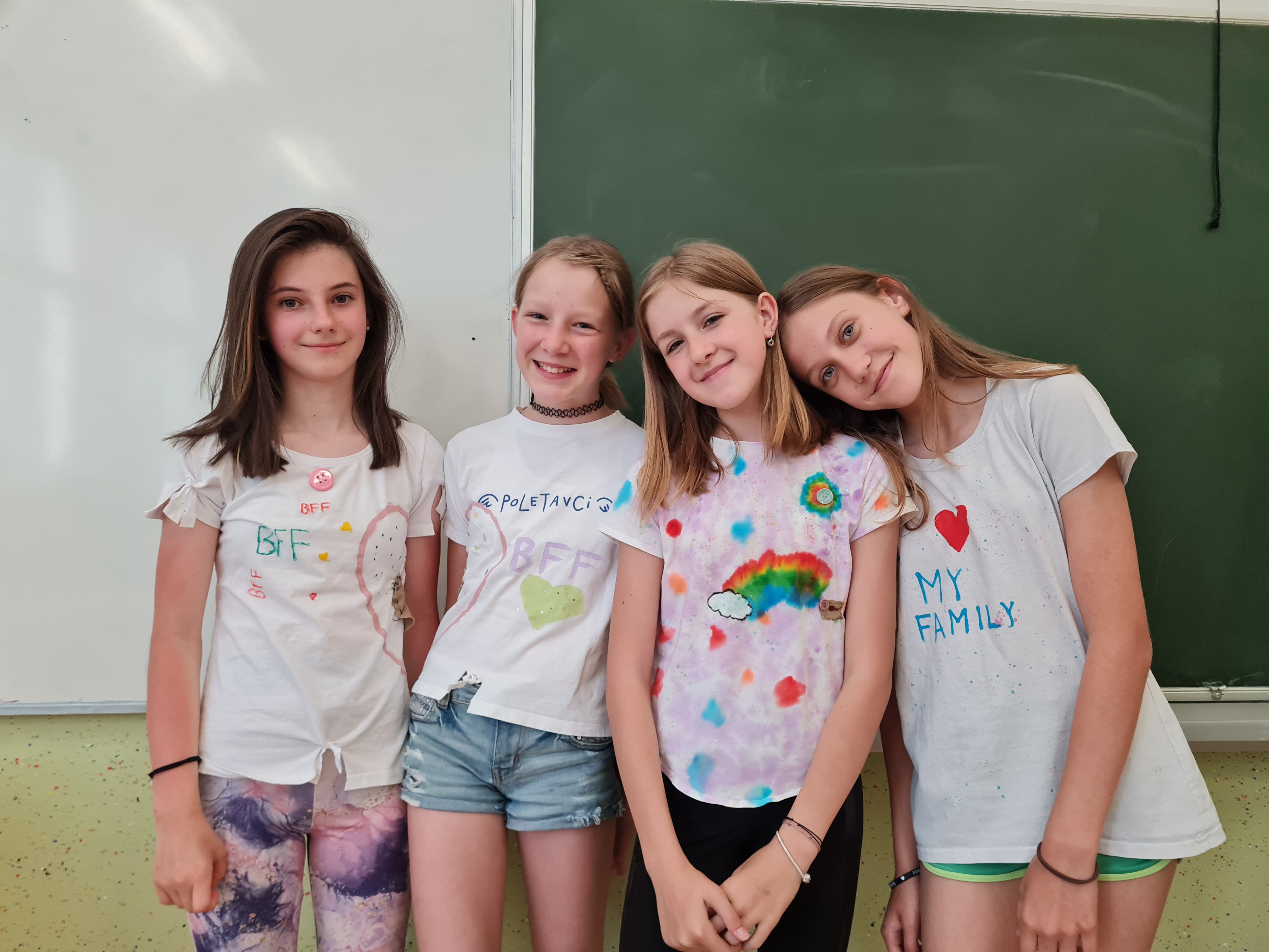 Petošolci matične šole smo minuli petek pri gospodinjstvu plemenitili tekstil. V šolo smo prinesli majice s kratkimi rokavi ter različne tekstilne barve, flomastre, našitke, kose blaga, gumbe vseh vrst in oblik, šiviljske pripomočke … in si izdelali unikatne poletne majice, na katere smo bili zelo ponosni.