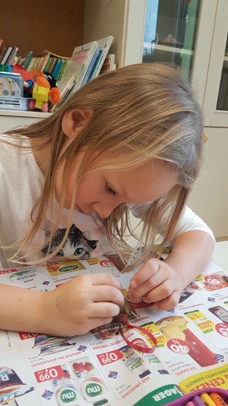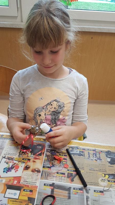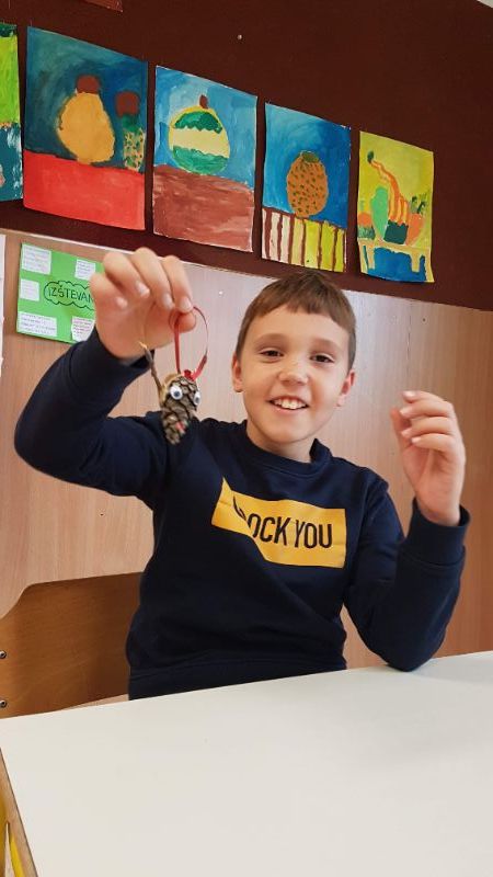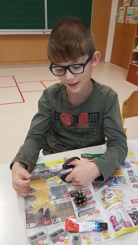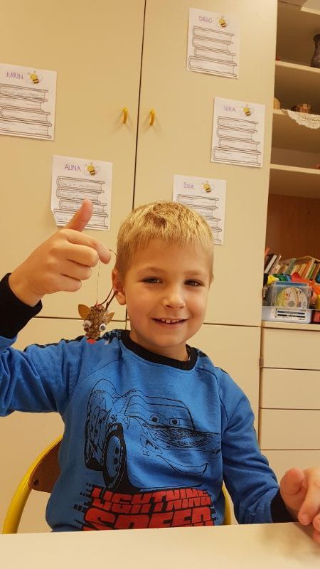 Najprej smo se lotili izdelave okraskov za božično drevesce. Iz borovih storžkov in vejic smo izdelali jelenčke.