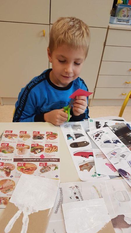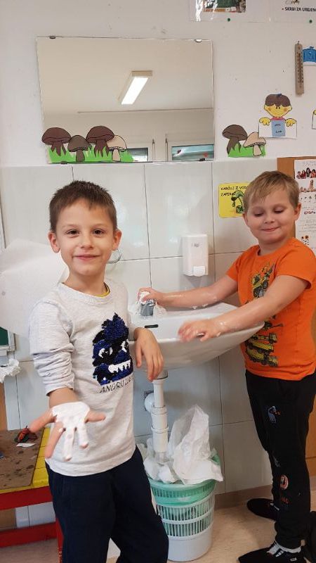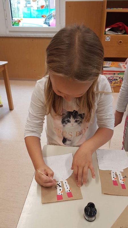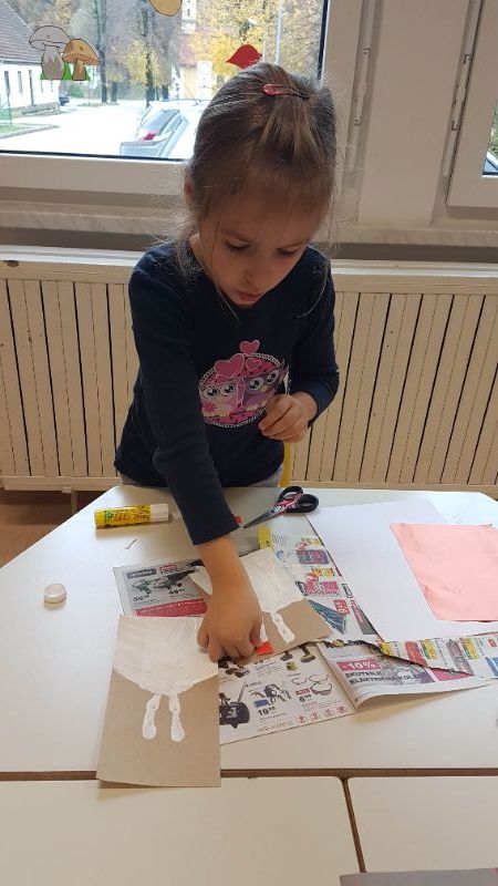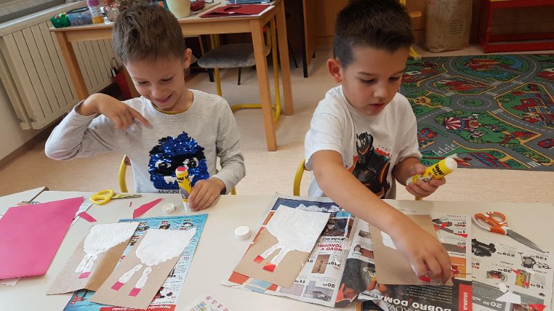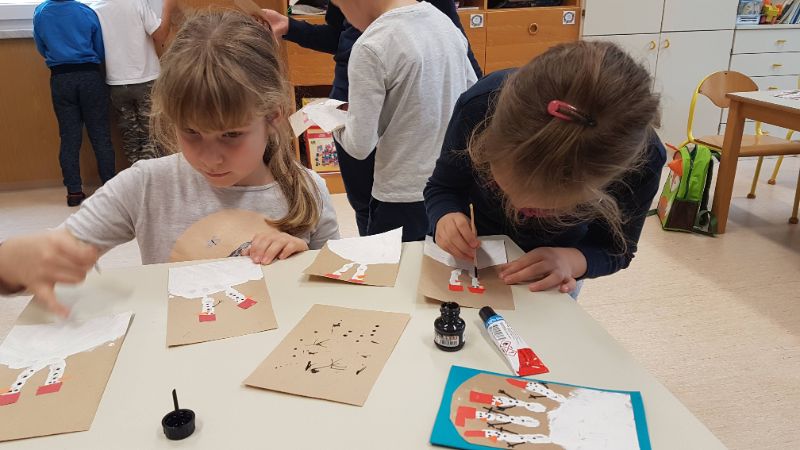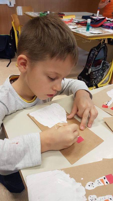 Sledila je še delavnica izdelave novoletnih voščilnic. Najprej smo izdelali snežno obarvane voščilnice, kjer je bila osnova odtis dlani in prstov. Snežakom smo dodali kape iz kolaža ter jim narisali gumbe, usta in roke.