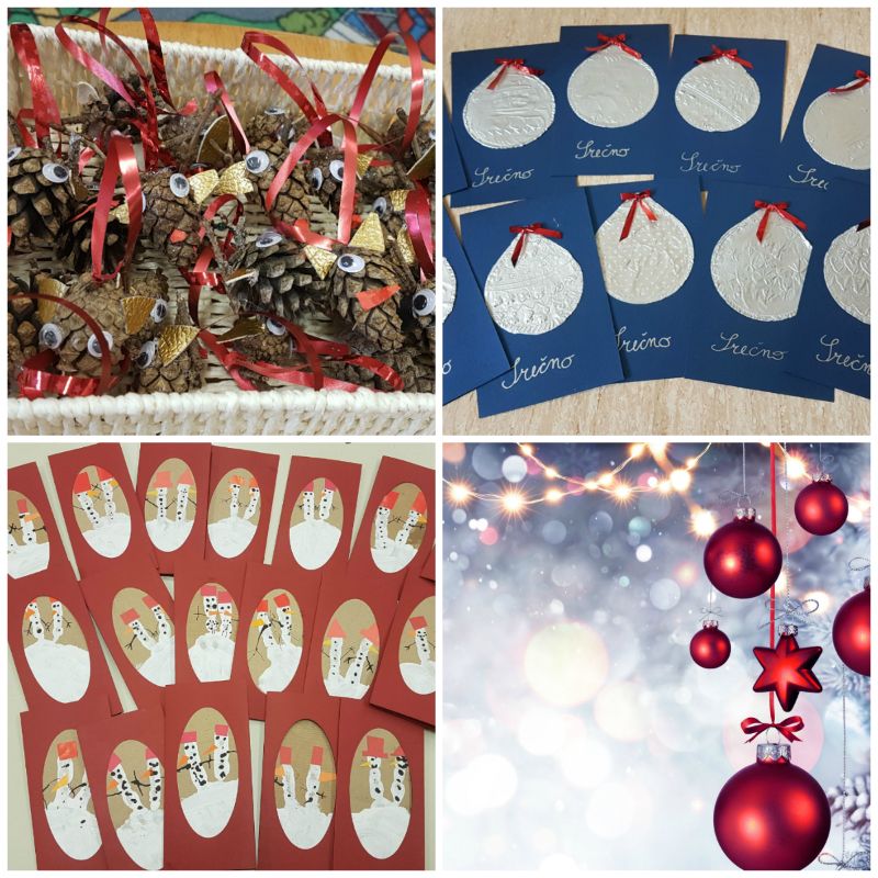 Za zaključek smo iz odpadnih pokrovčkov jogurtov izdelali novoletne bučke, jih okrasili z reliefi, ter nalepili na voščilnice.