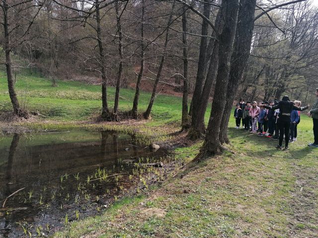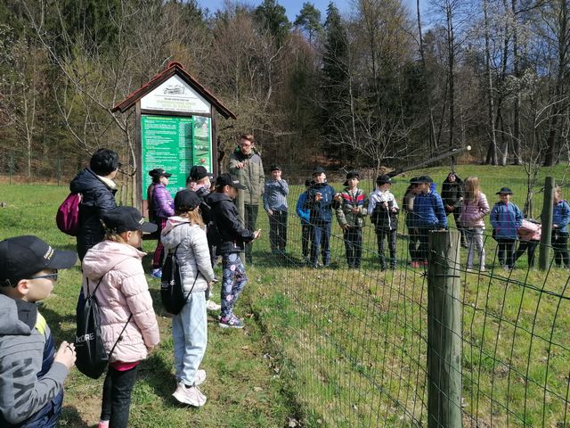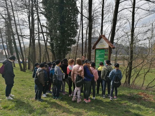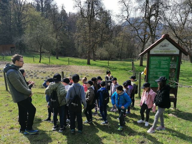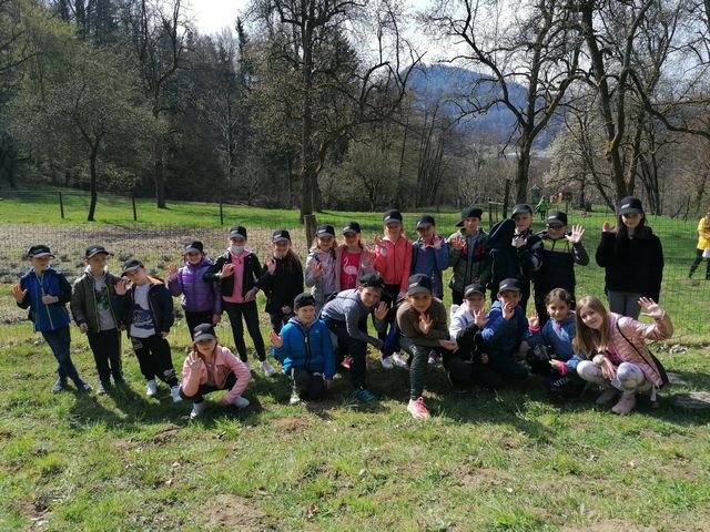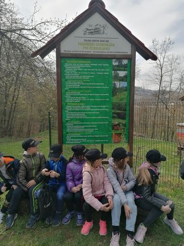 Po uvodnem pozdravu smo prejeli vrečko presenečenja. Hitro smo pogledali, kaj smo dobili, nato pa si na glavo z veseljem poveznili nove kape in se podali na pot. Študenta Višje strokovne šole Šentjur sta nas popeljala po njihovem čudovitem posestvu. Sprehodili smo se po ekološki učni poti, videli šolski ribnik, travniški sadovnjak in čebelnjak, permakulturne grede, hotel za žuželke ter del gozda. Izvedeli smo veliko zanimivega, bili smo tudi pohvaljeni, saj o naravi in živalih vemo zelo veliko.