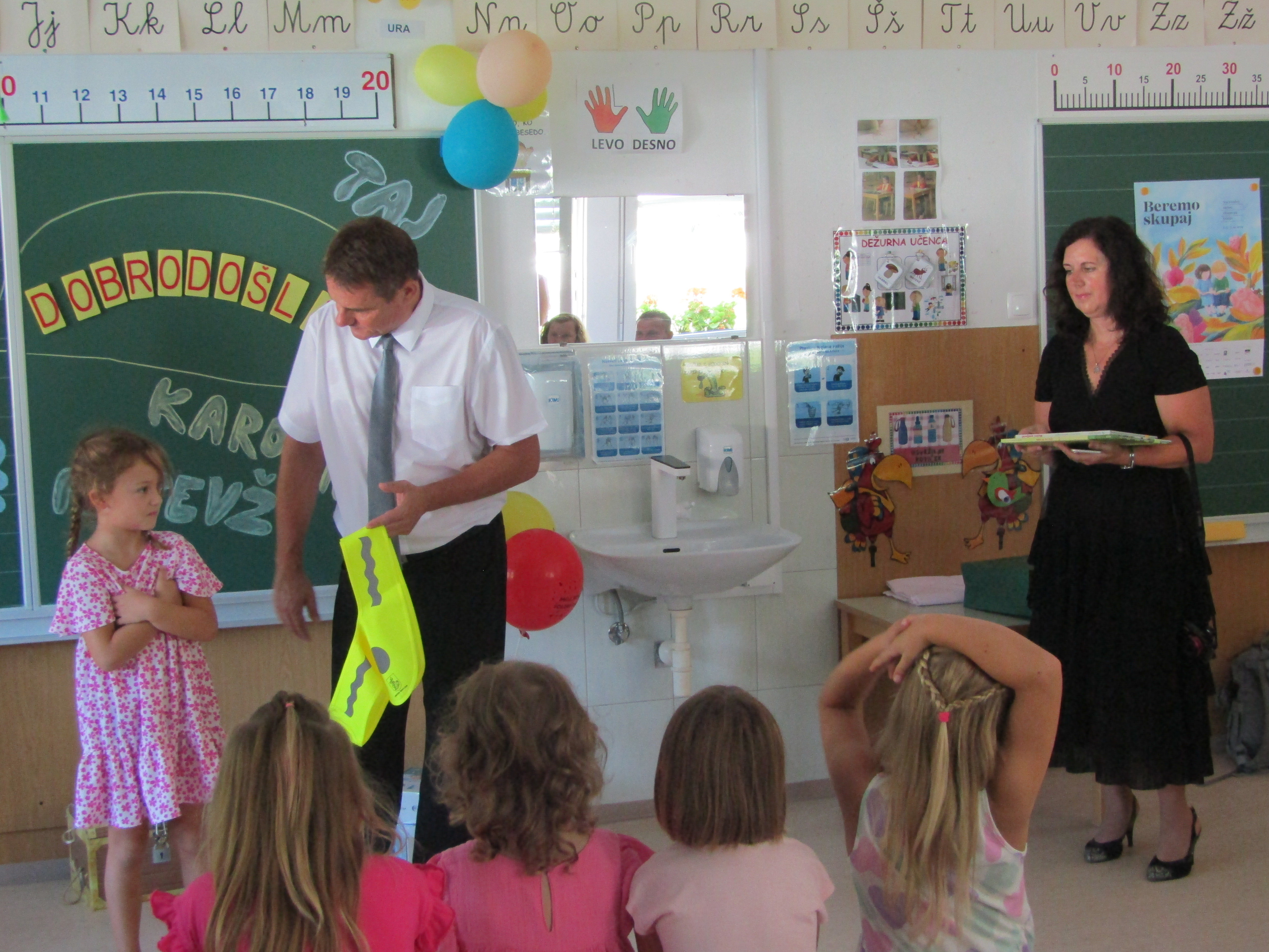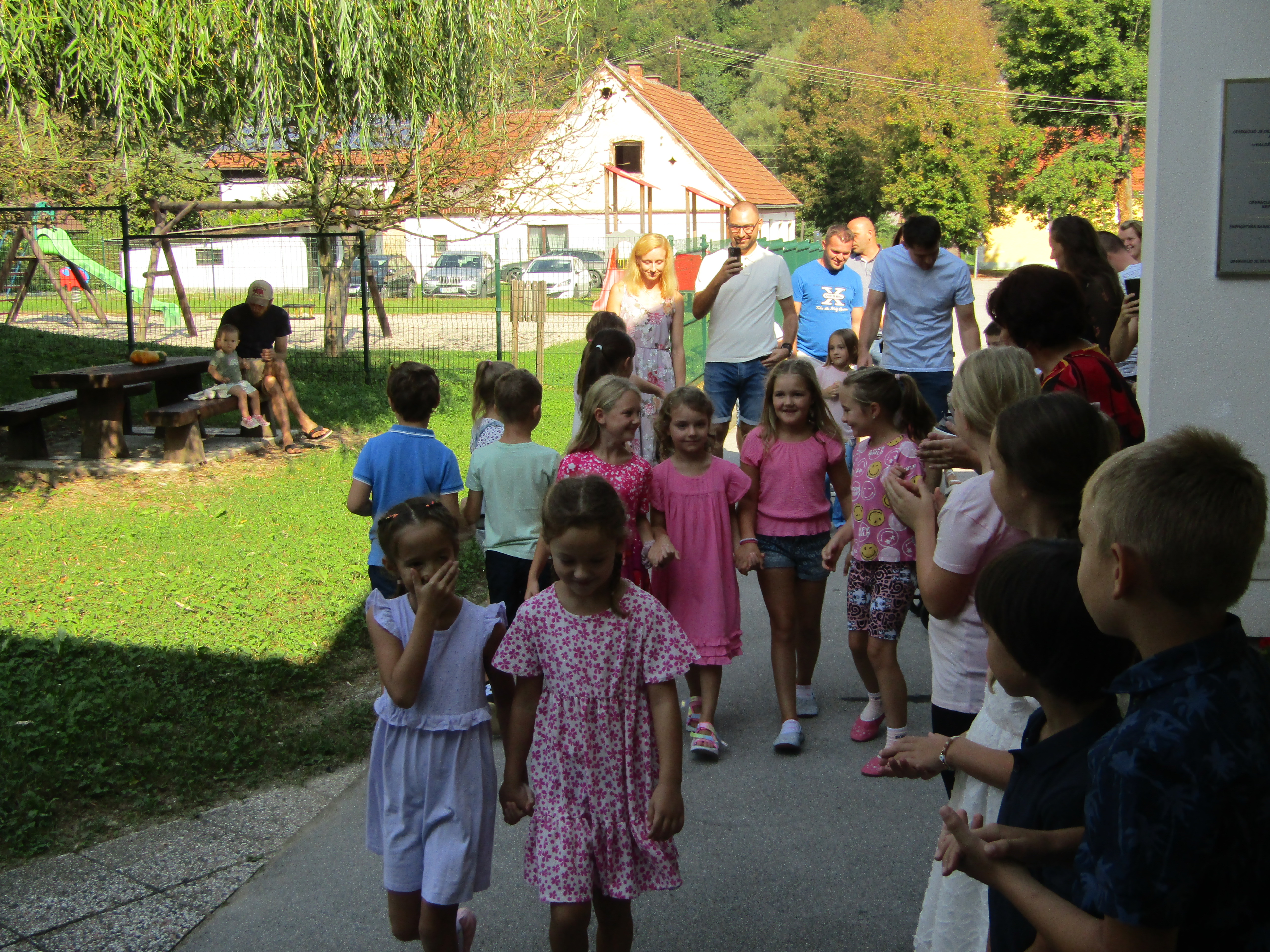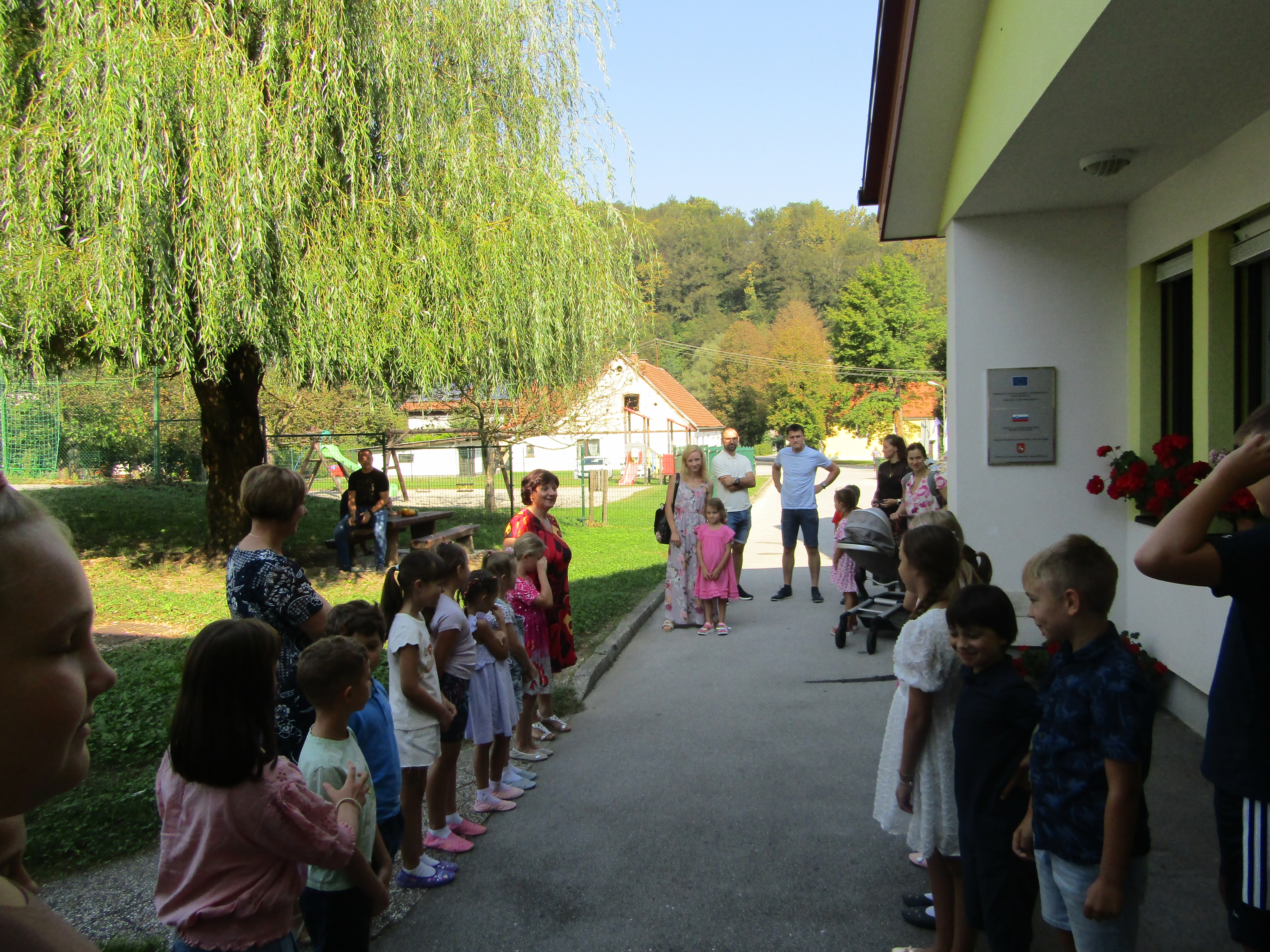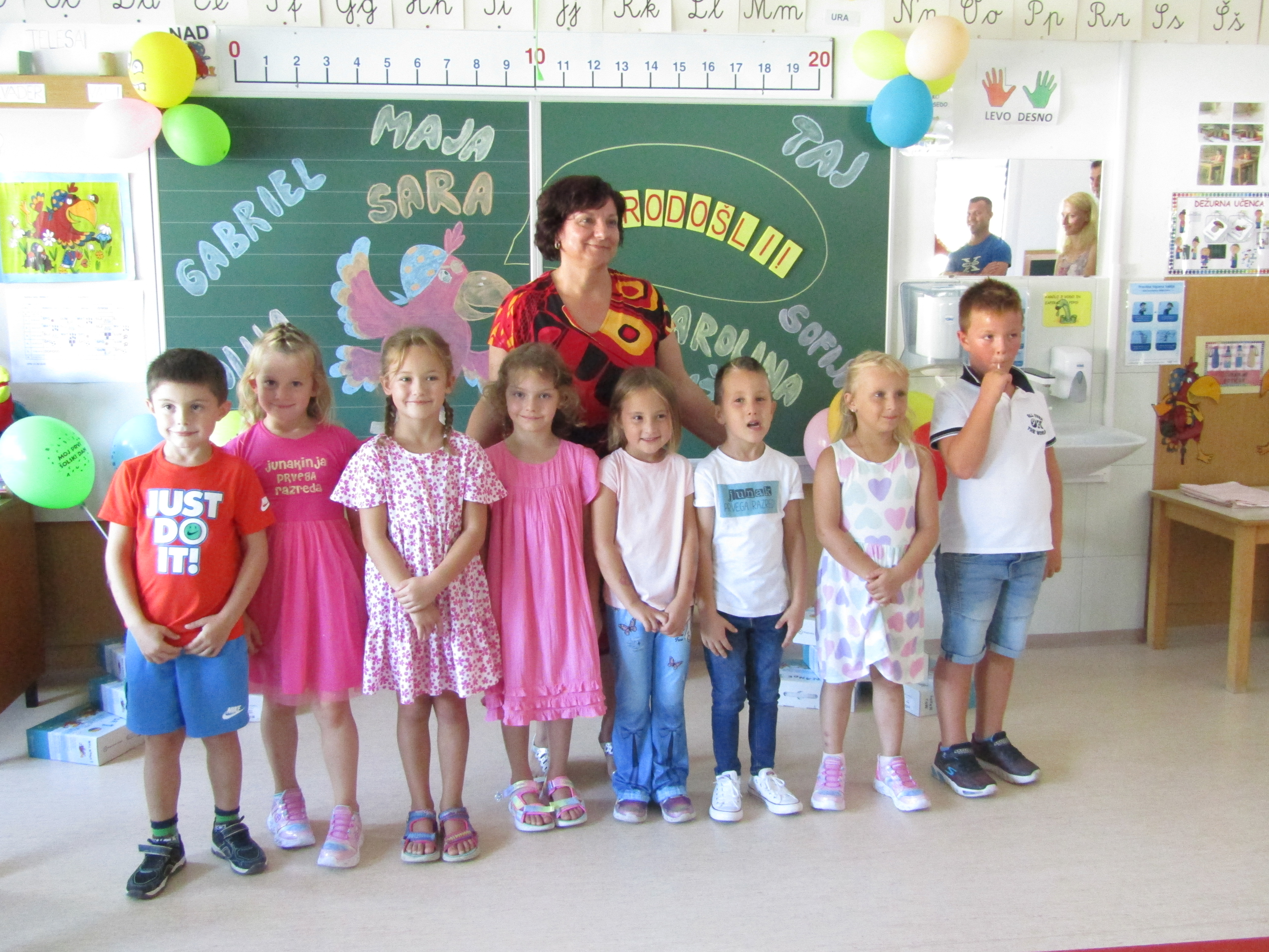 Na 1. šolski dan smo danes, 2. septembra pred šolo učenci in učiteljice veselo pričakali 8 prvošolcev z njihovimi starši. Ob Vallovem igranju na harmoniko so prvošolci v spremstvu večjih učencev prvič prestopili šolski prag. Njihov pomemben šolski dan so učenci po nagovoru vodje šole Fride Gubenšek popestrili s pestrim kulturnim programom, ki ga je vodila petošolka Zala.
