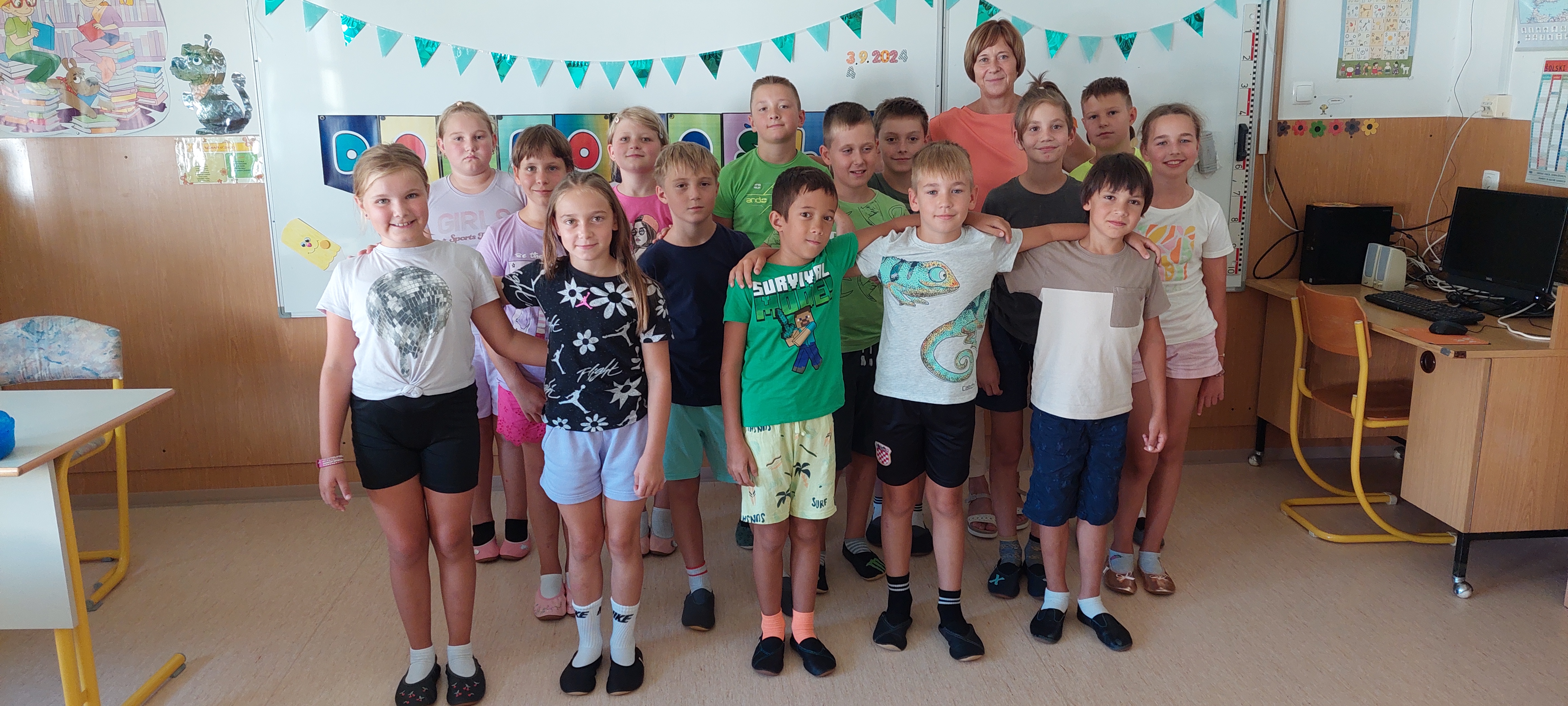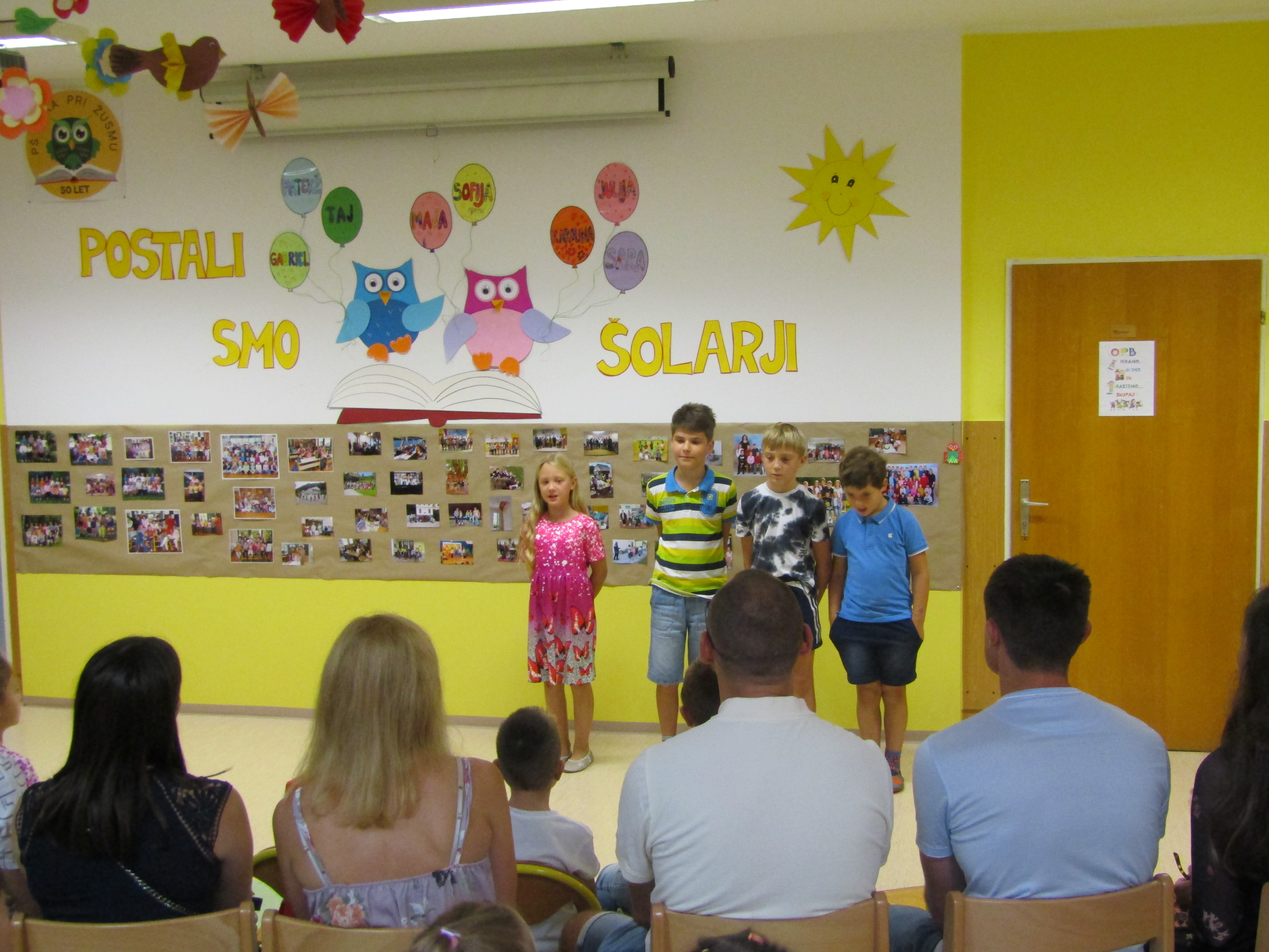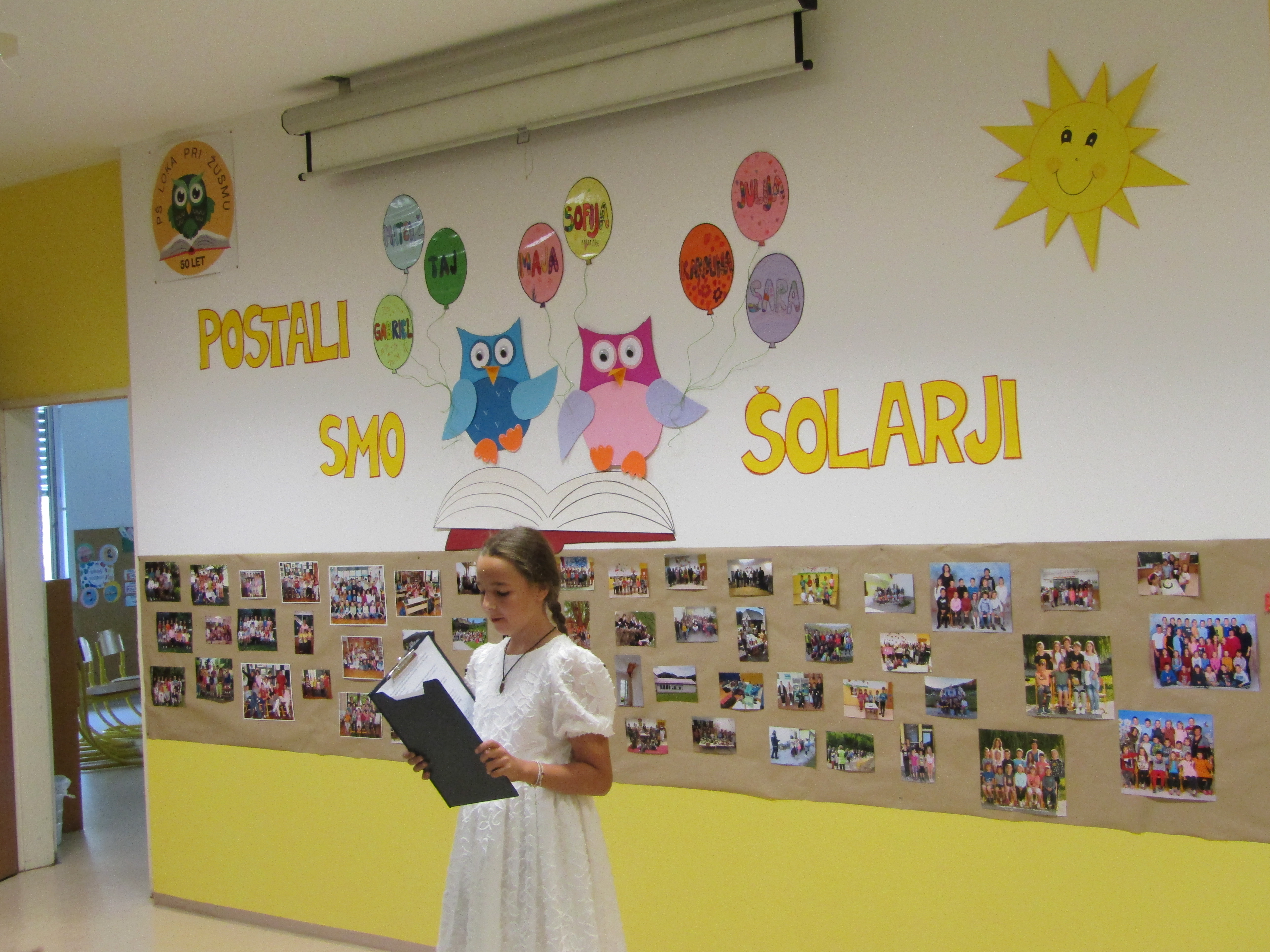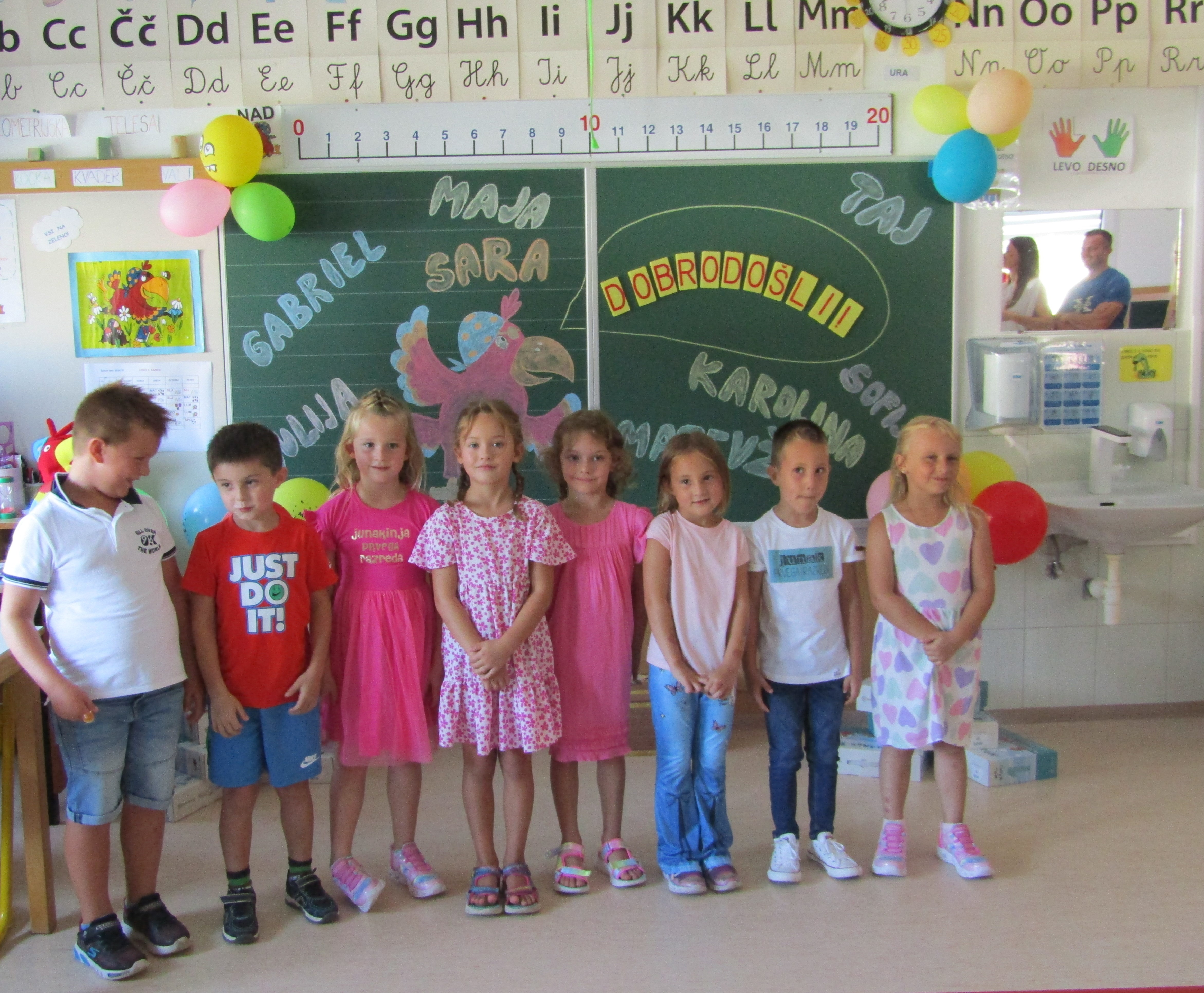 Na 1. šolski dan smo danes, 2. septembra pred šolo učenci in učiteljice veselo pričakali 8 prvošolcev z njihovimi starši. Ob Vallovem igranju na harmoniko so prvošolci v spremstvu večjih učencev prvič prestopili šolski prag. Njihov pomemben šolski dan so učenci po nagovoru vodje šole Fride Gubenšek popestrili s pestrim kulturnim programom, ki ga je vodila petošolka Zala.