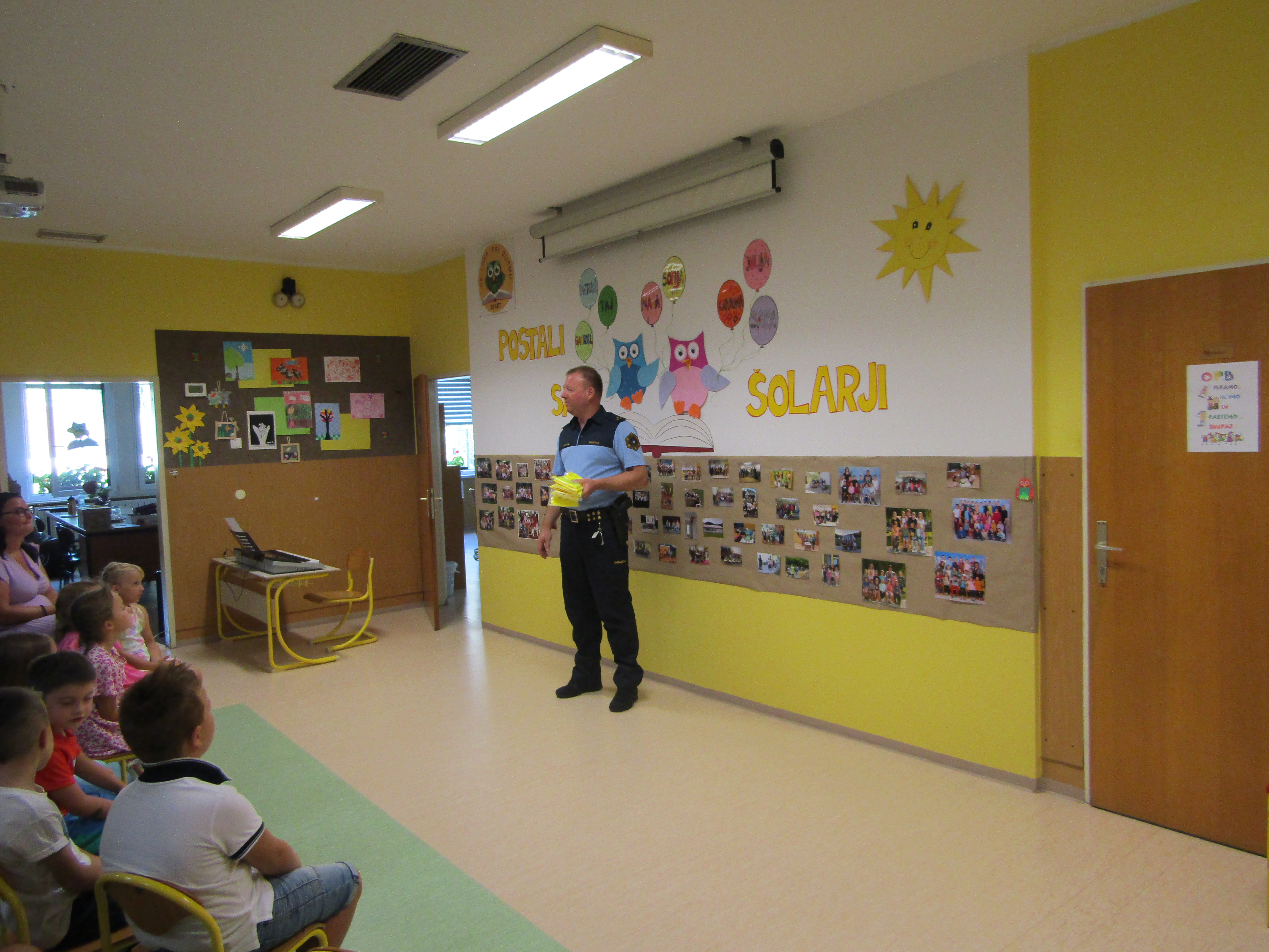 Nato pa je vse navzoče prišel pozdraviti tudi policist Uroš Malgaj ter povedal nekaj pomembnih besed o varnosti v prometu ter prvošolcem podelil rumene rutice.