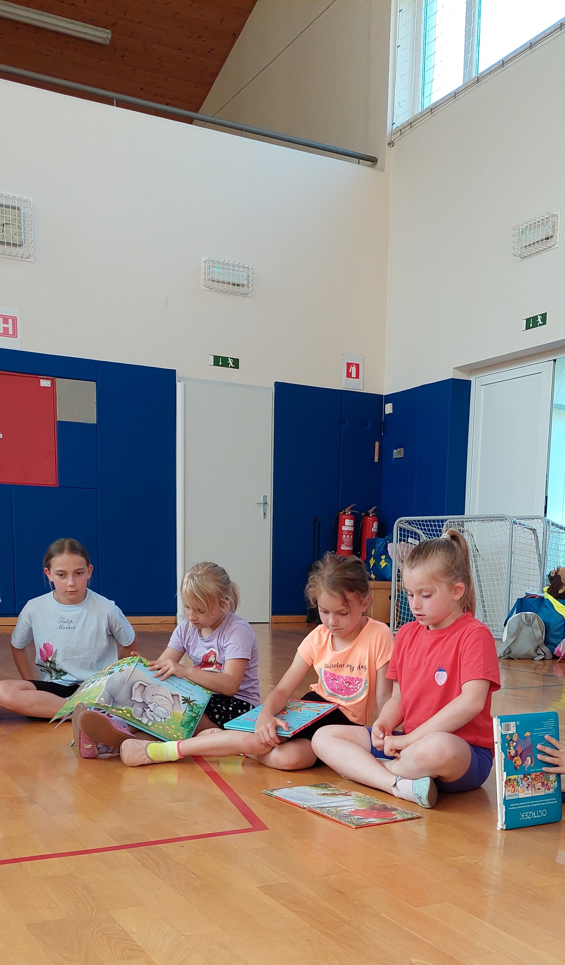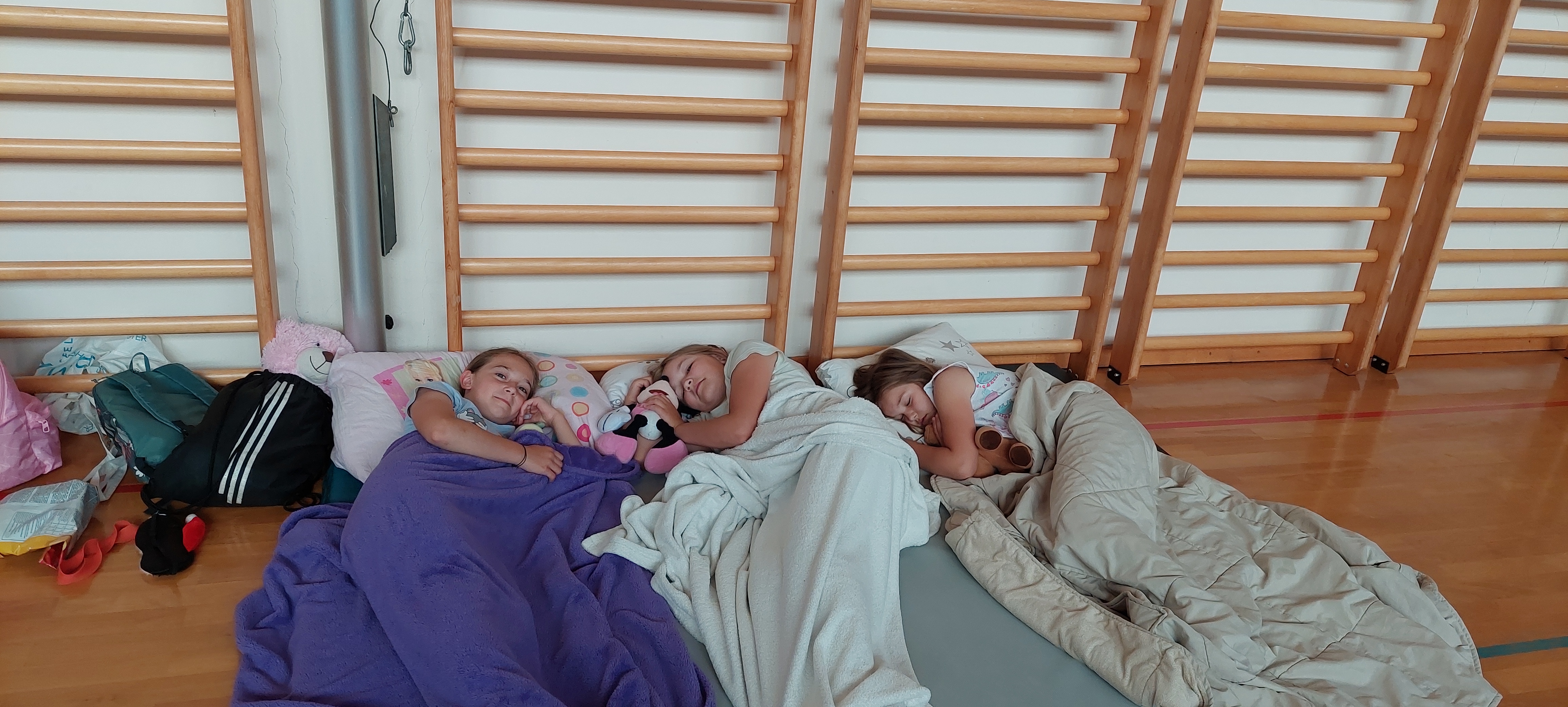Stvari smo odložili v telovadnico, vzeli knjige in pripovedovanje najljubše pravljice se je pričelo. Sledila je večerja. Palačinke z marmelado so bile slastne, trebuščki polni in potrebna je bila telovadba. Odšli smo na igrišče, kjer smo igrali hokej ter med dvema ognjema. Pričelo se je temniti in odšli smo v jedilnico, kjer smo imeli kino. Uživali smo, a utrujenost je bila po napornem tednu velika, zato smo kaj kmalu odšli v telovadnico in si pripravili ležišča. Poskrbeli smo za osebno higieno, poslušali pravljice ter počasi drug za drugim zaspali.
