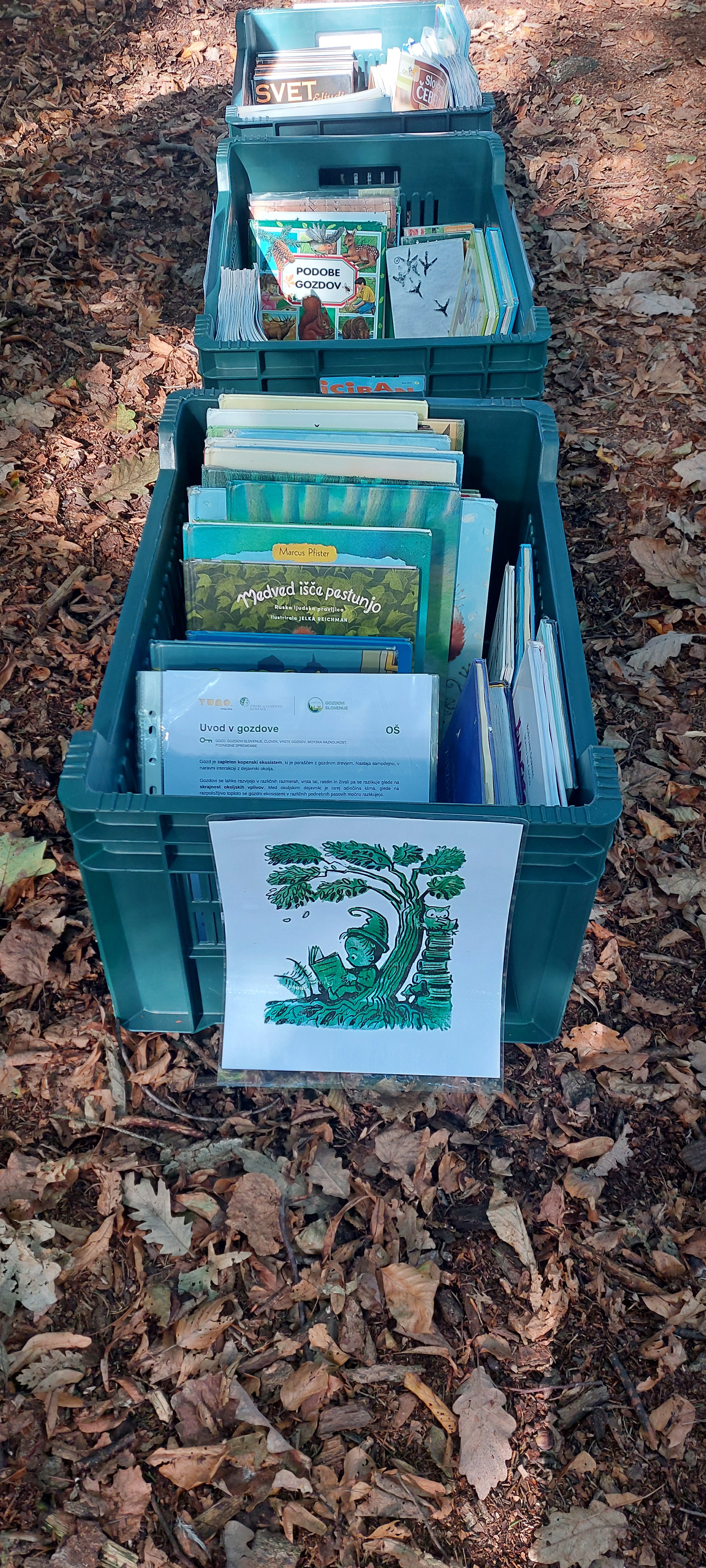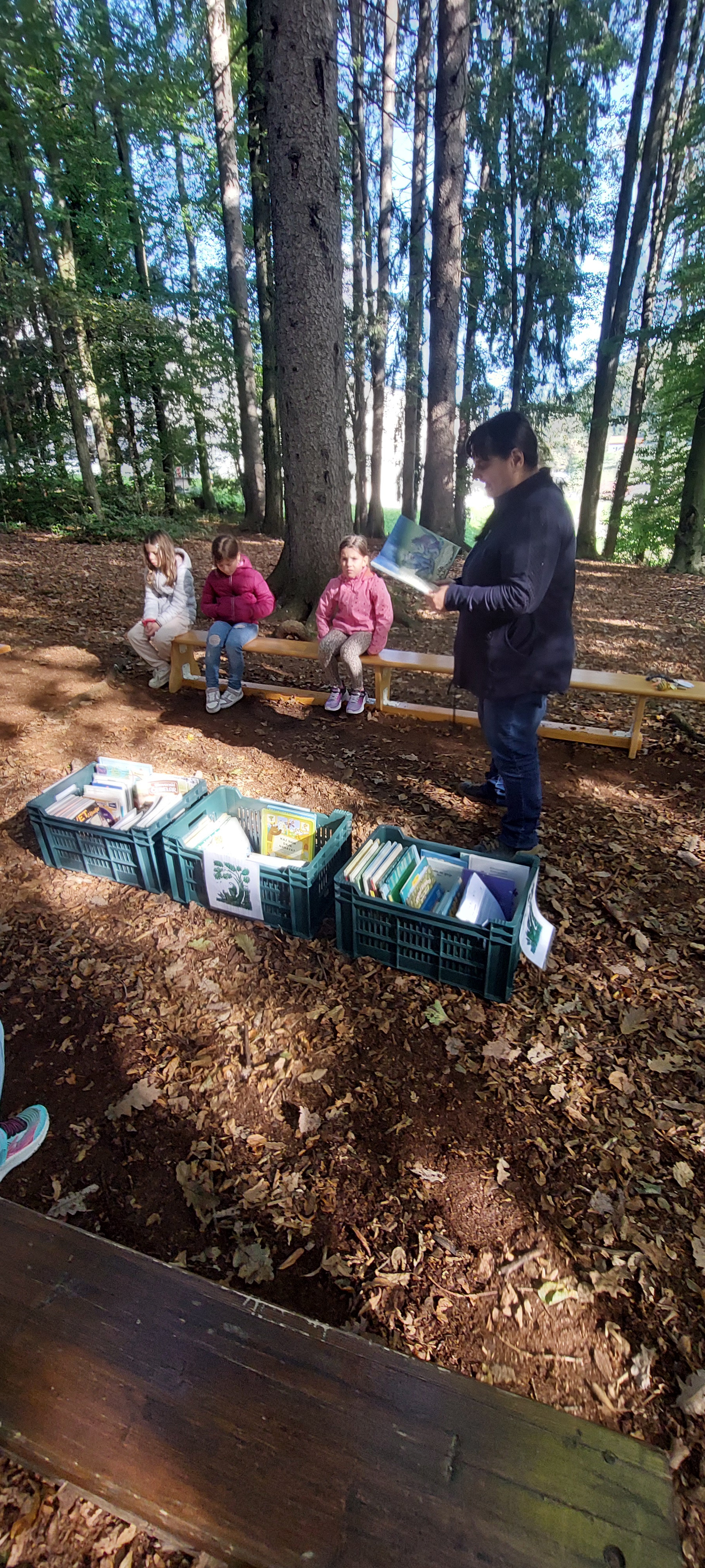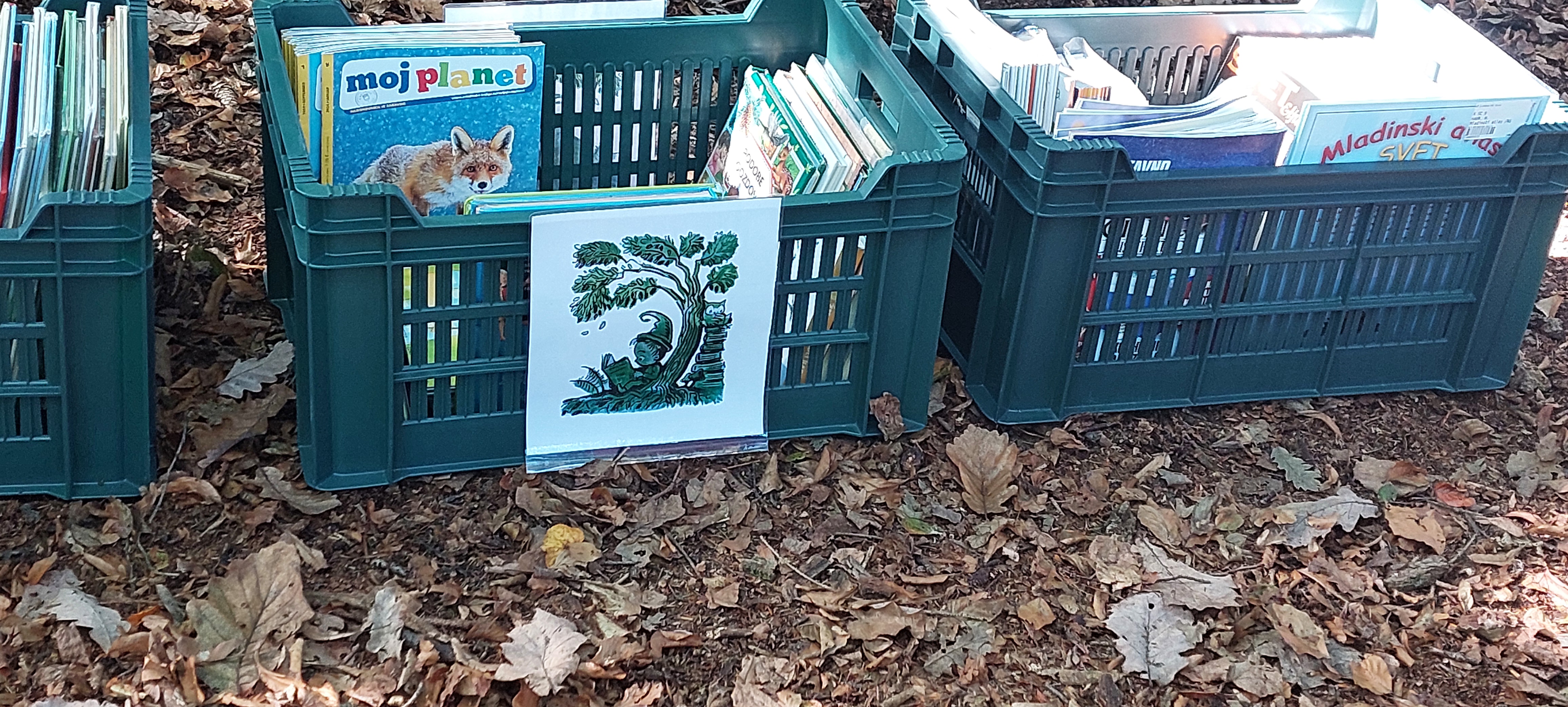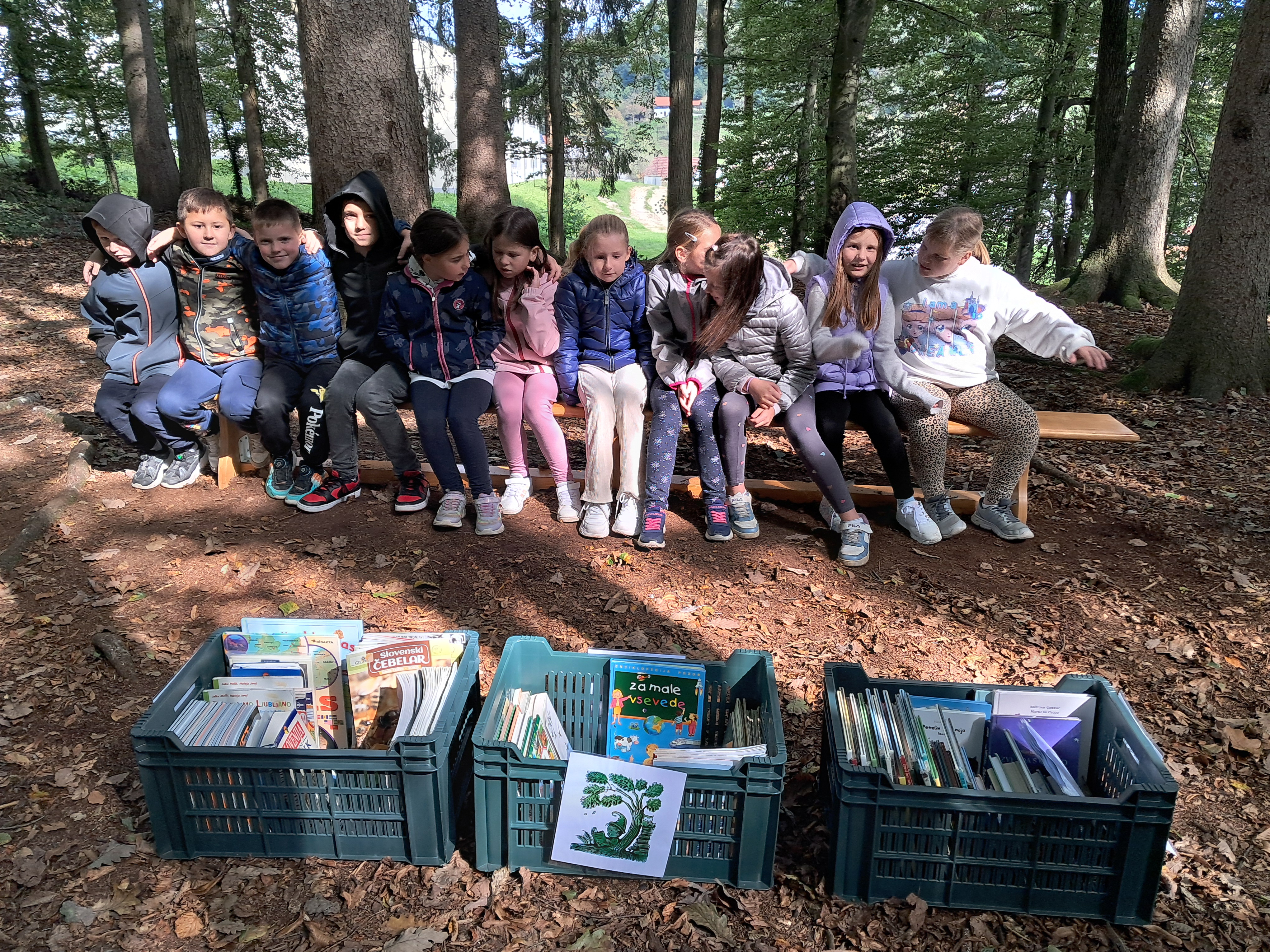 V bližnjem gozdu smo za en dan vzpostavili gozdno knjižnico. V sredo, 1. oktobra 2025, so jo v okviru pouka ali v času podaljšanega bivanja v spremstvu učiteljev obiskali vsi učenci od prvega do devetega razreda. Branje v gozdni knjižnici smo organizirali na pobudo Turistične zveze Slovenije, Gozdarske knjižnice in Andragoškega centra Slovenije.