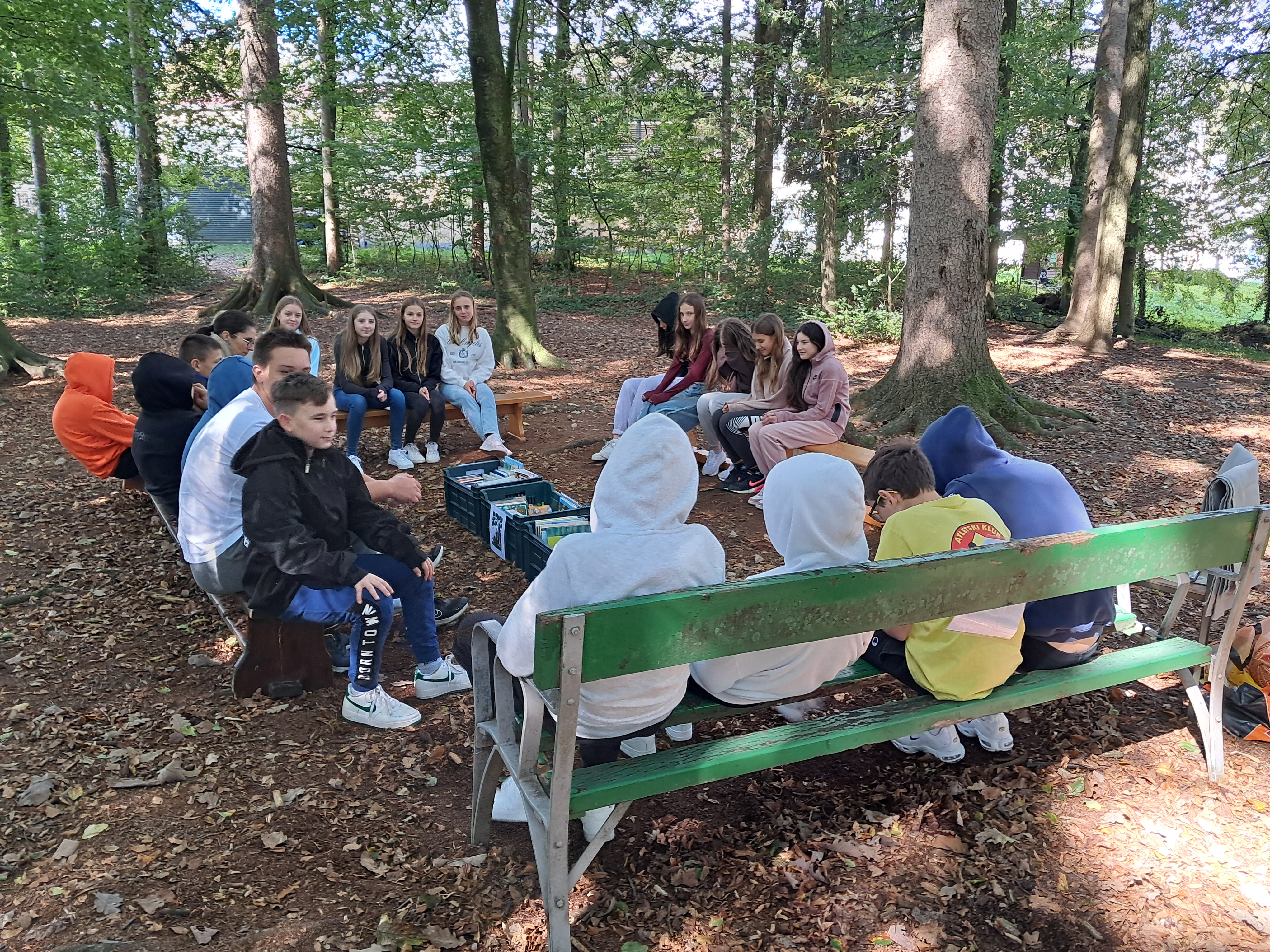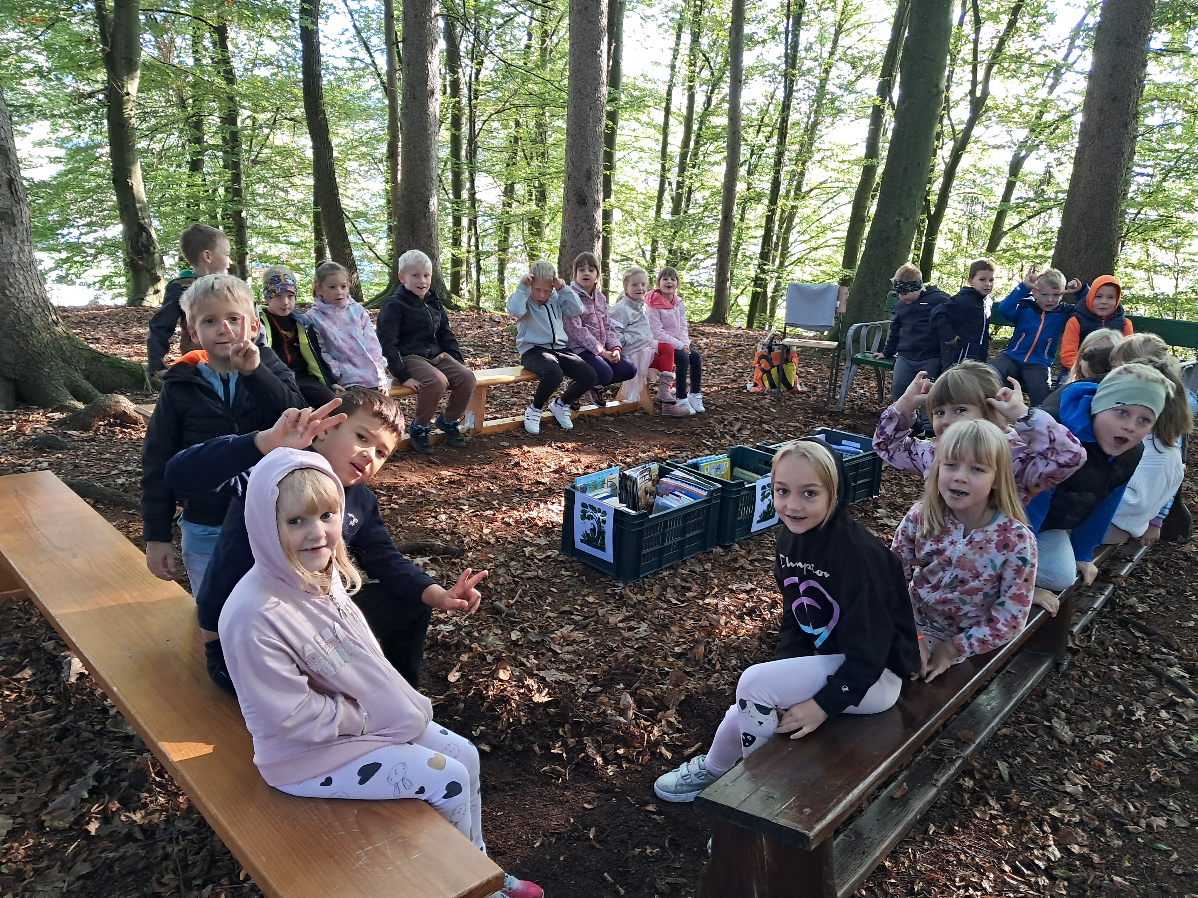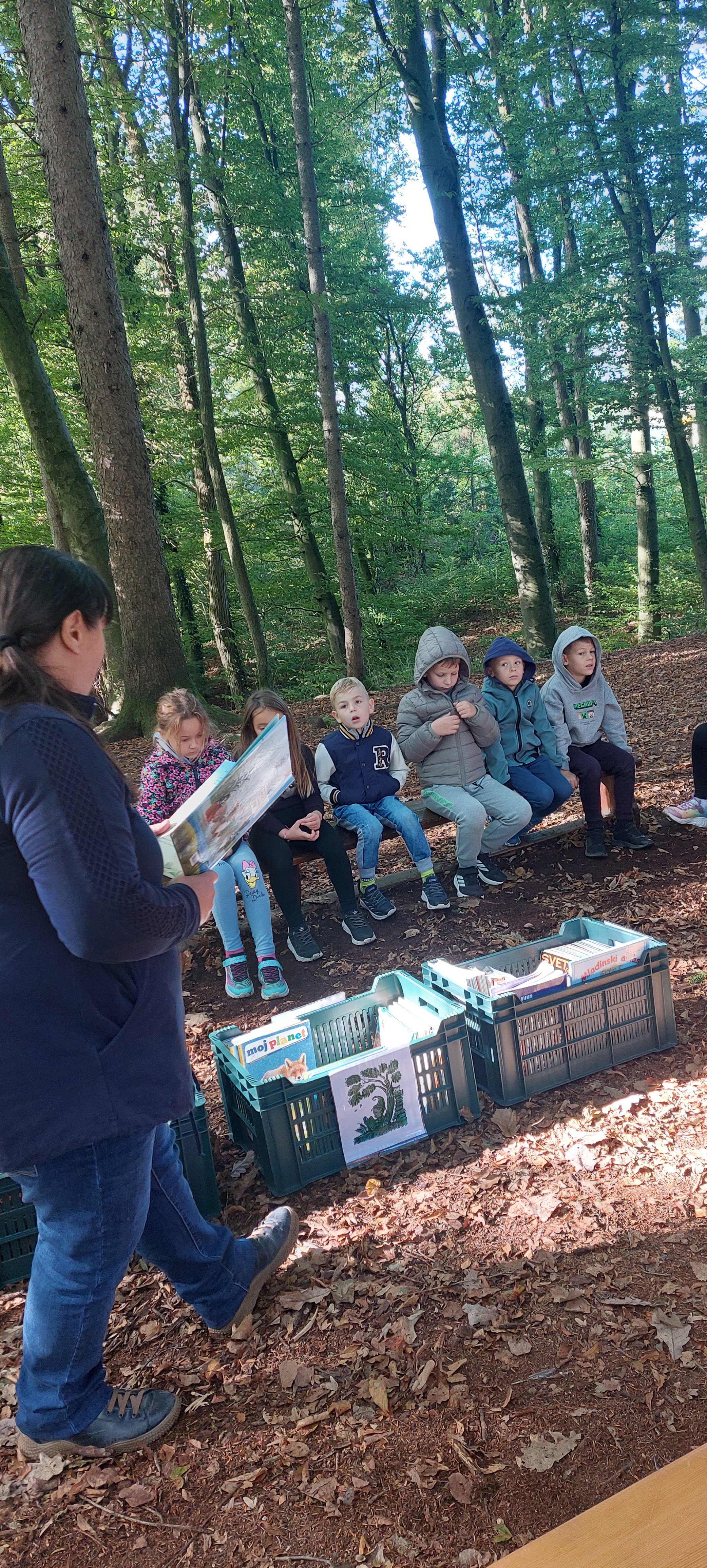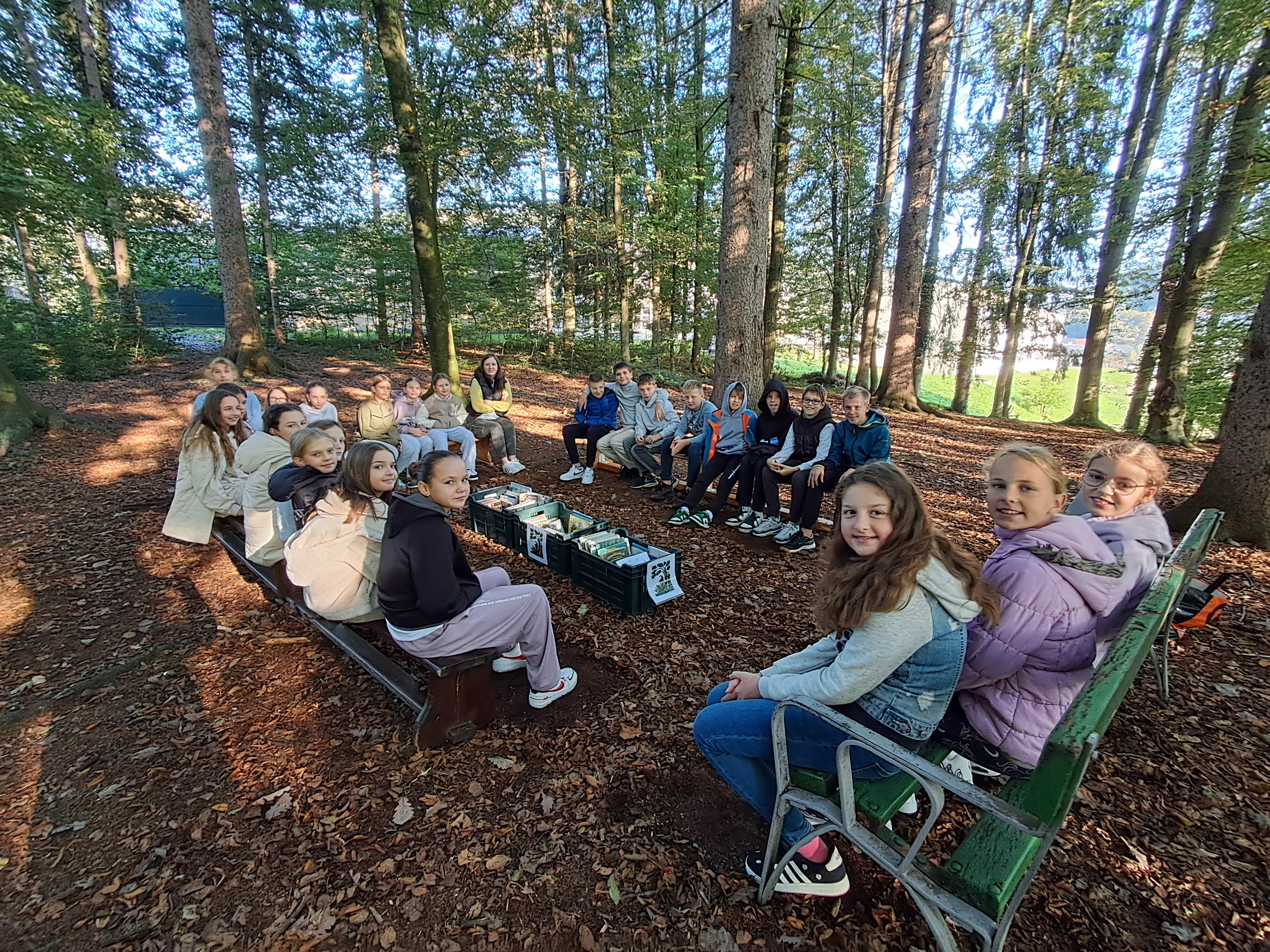 V bližnjem gozdu smo za en dan vzpostavili gozdno knjižnico. V sredo, 1. oktobra 2025, so jo v okviru pouka ali v času podaljšanega bivanja v spremstvu učiteljev obiskali vsi učenci od prvega do devetega razreda. Branje v gozdni knjižnici smo organizirali na pobudo Turistične zveze Slovenije, Gozdarske knjižnice in Andragoškega centra Slovenije.