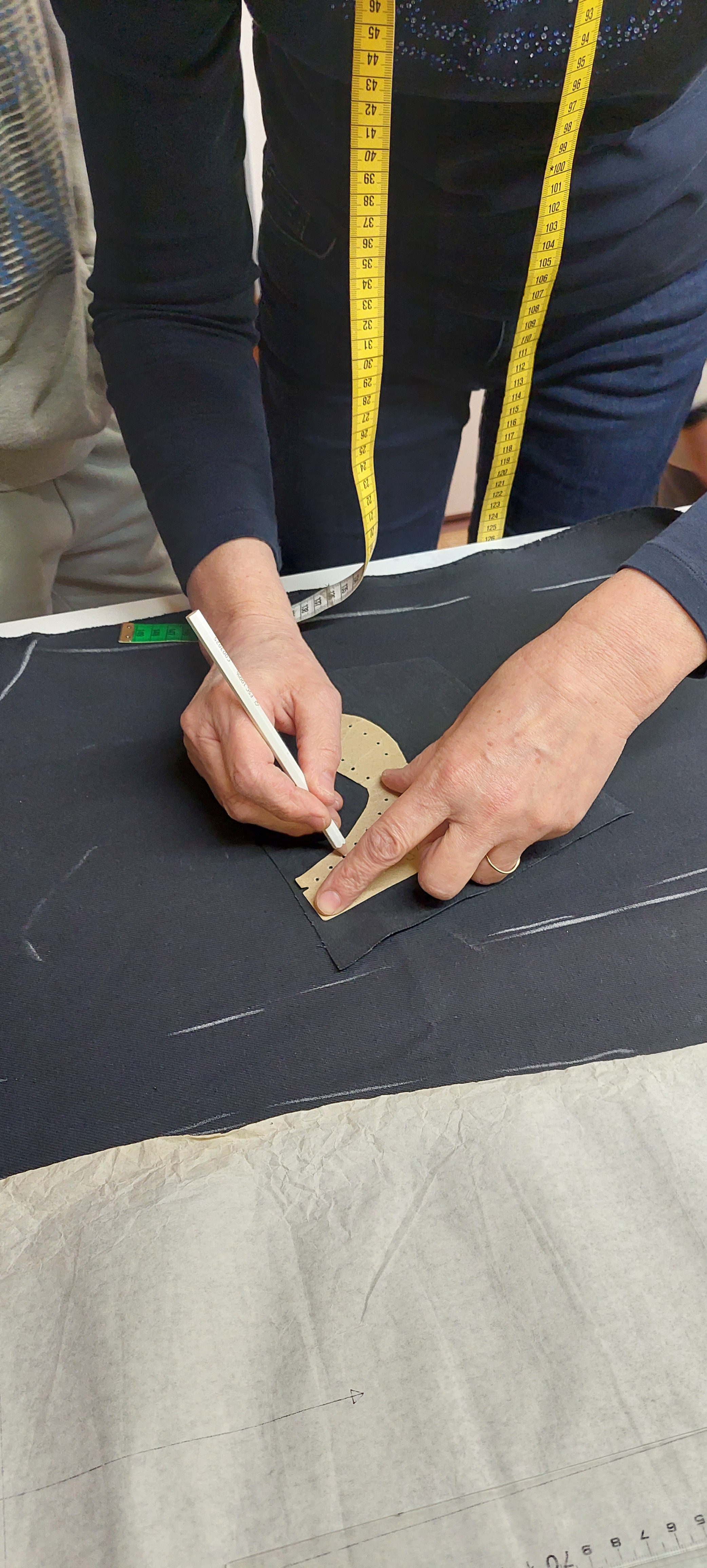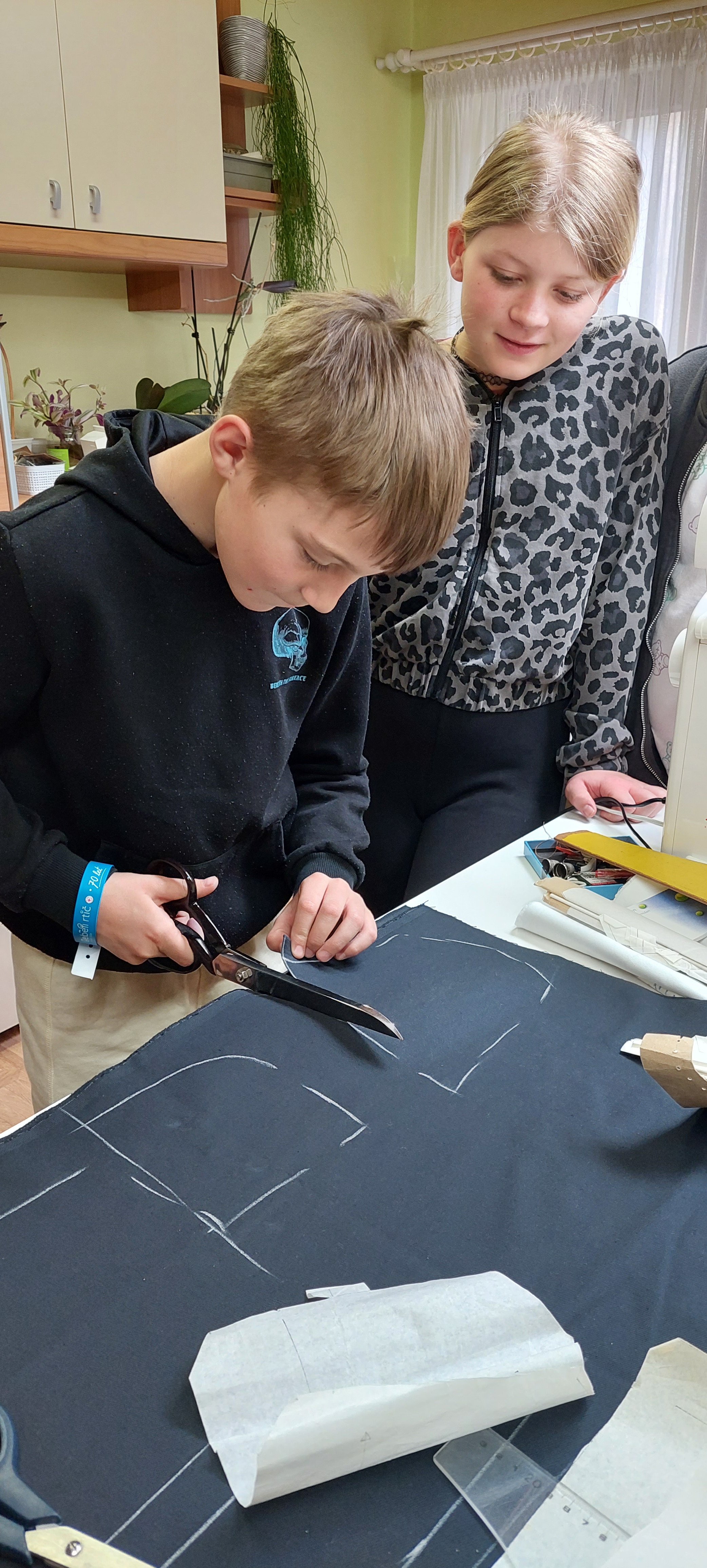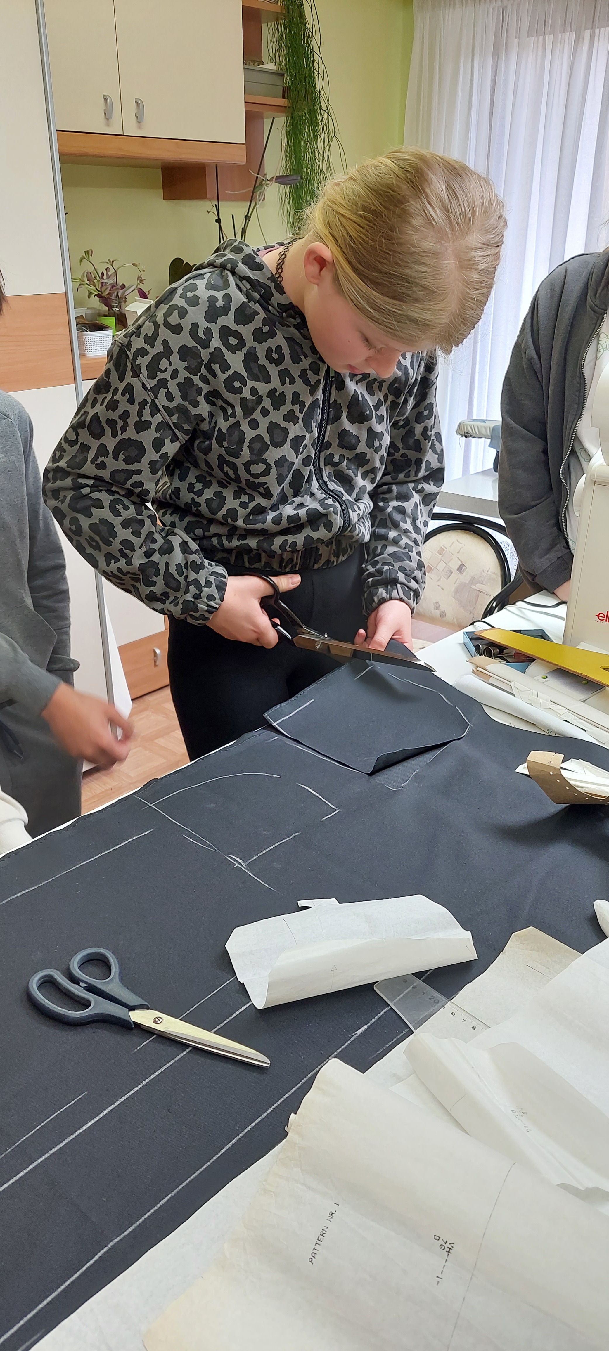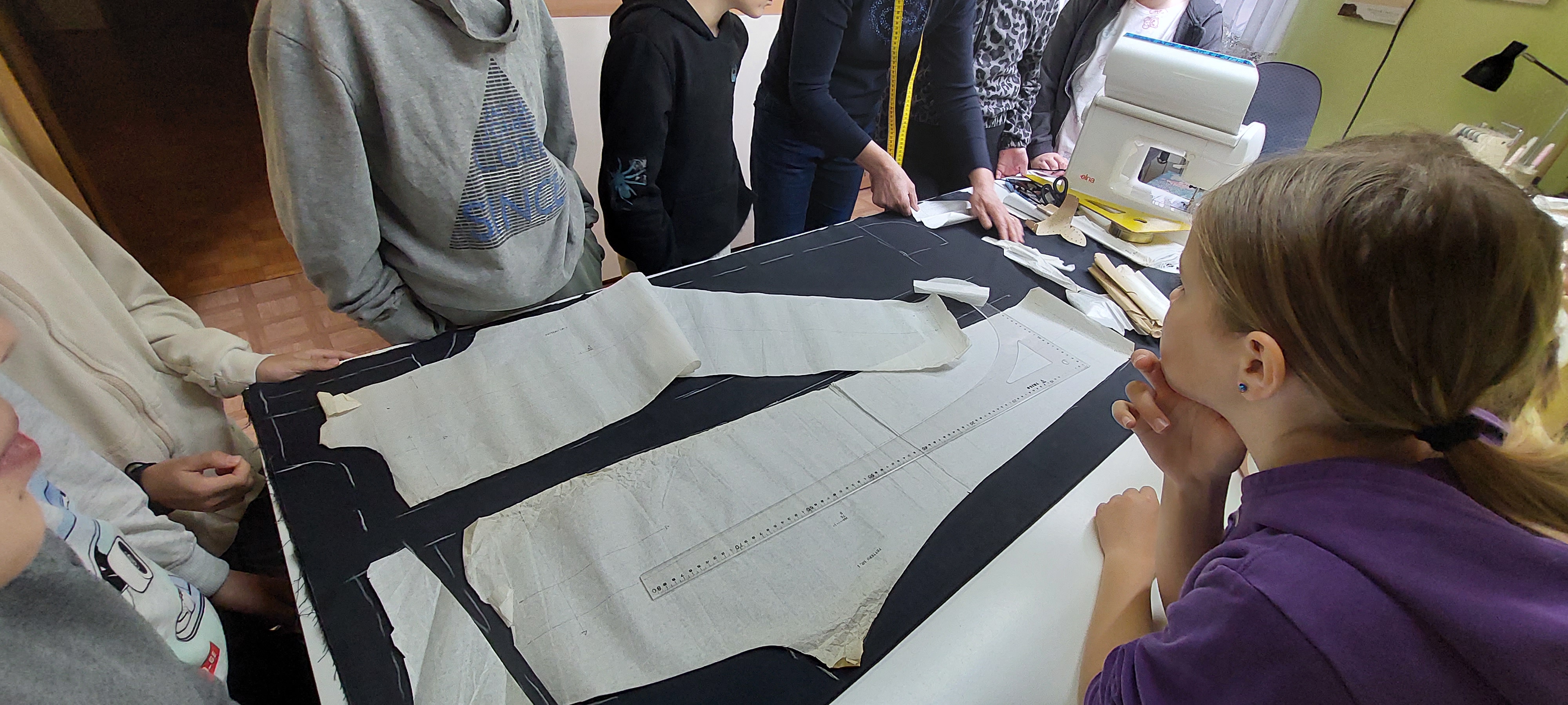 Najprej nam je pokazala različne šivalne stroje in druge pripomočke, ki jih uporablja pri delu. Nato nam je razložila, kako nastanejo hlače. Pripravili smo blago in nanj položili kroj ter ga obrisali s kredo. Vsi smo poskusili rezati tudi s škarjami, ki režejo samo blago. Ugotovili smo, da je to precej težje kot izgleda. Želeli smo narediti različne vzorce s šivalnim strojem. Nekaj nam jih je uspelo naredili, nato pa nas šivalni stroj ni hotel več ubogati. Nitke so se zapletle in šivanja je bilo konec. A šivilja Vida ga bo že popravila! Na koncu je žep na drugem šivalnem stroju sešila še gospa Vida. Bil nam je tako všeč, da smo ga vzeli kar s seboj v šolo.