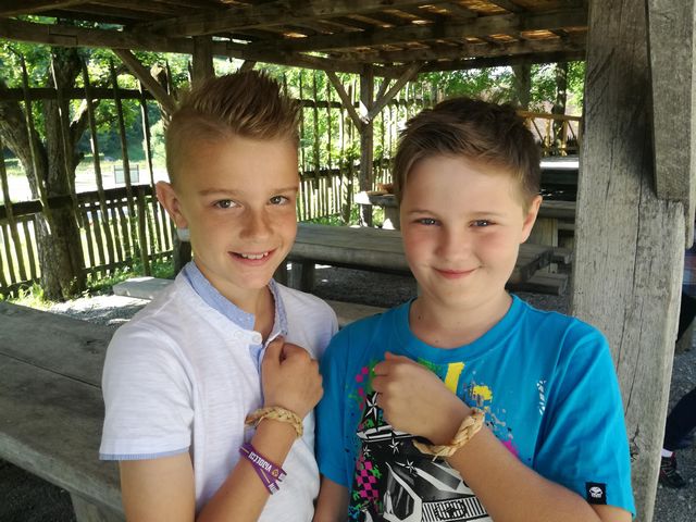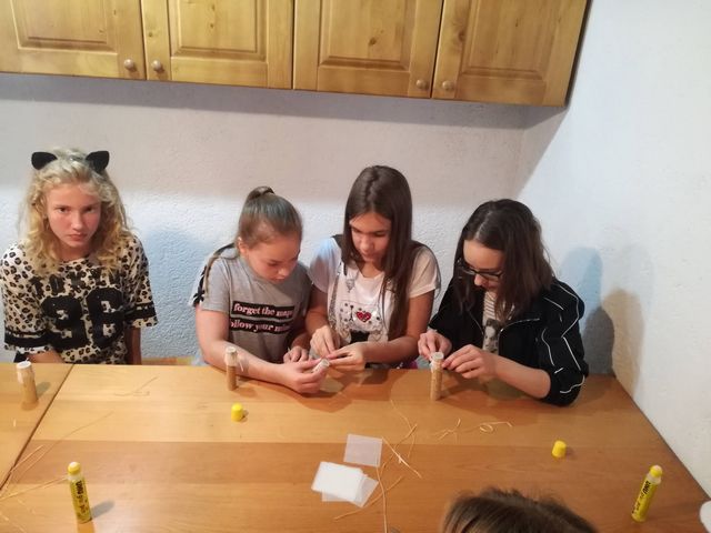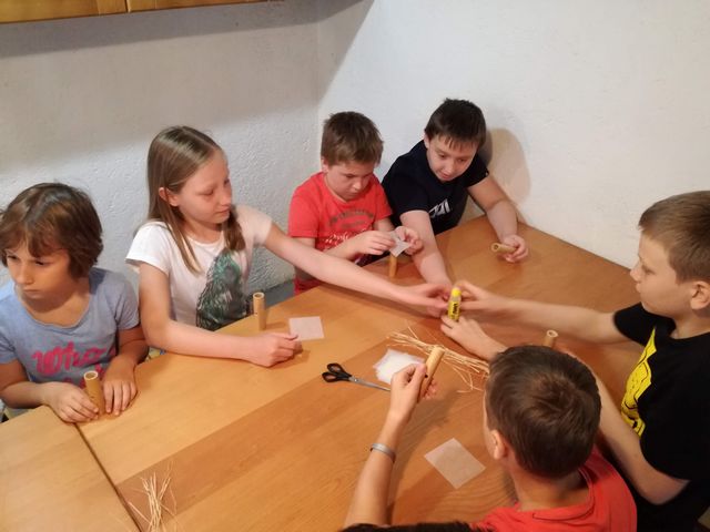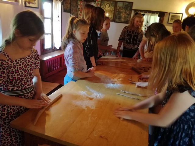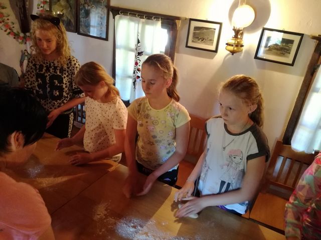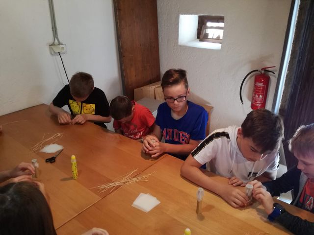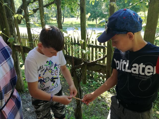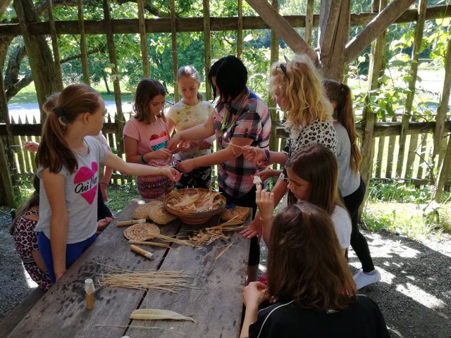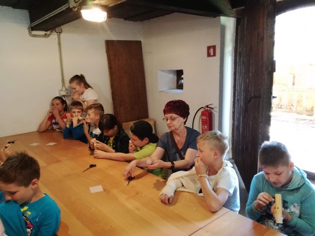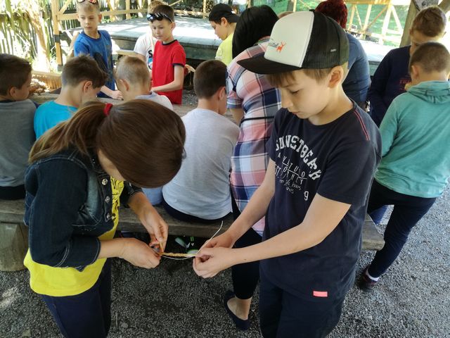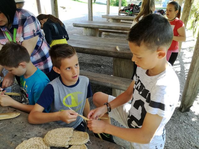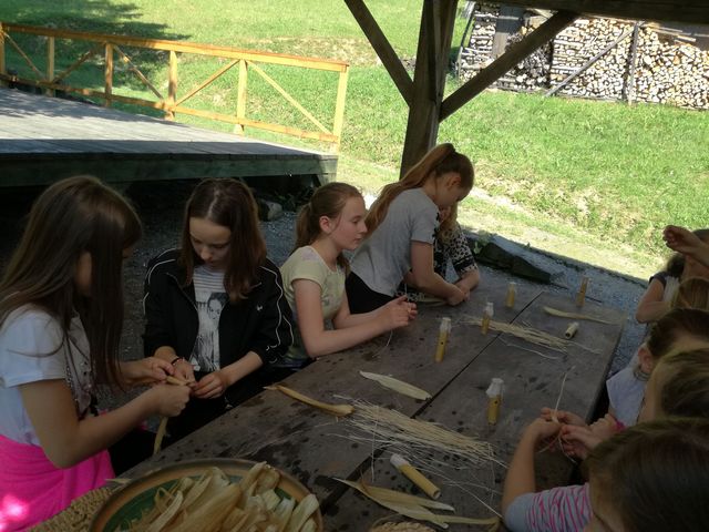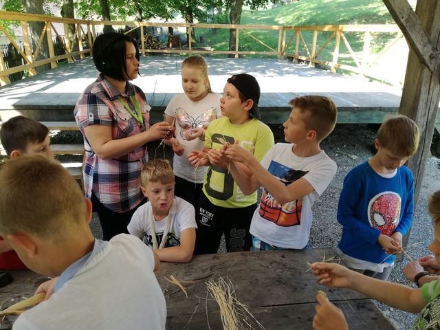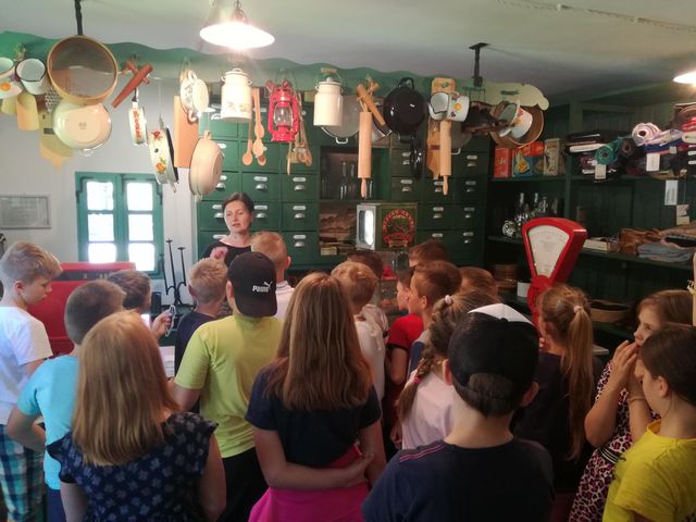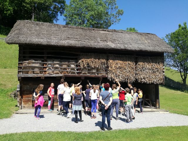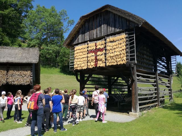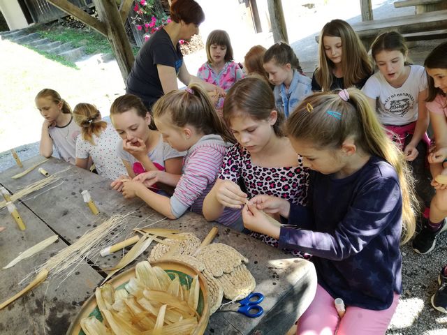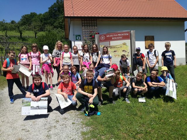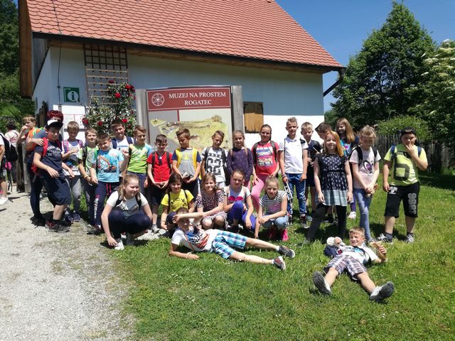 Učenci 4. in 5. razreda se pri družbi učijo in radi pogovarjajo o zgodovini, zato so se obiska Muzeja na prostem Rogatec res veselili. Sprehodili so se skozi vasico in si poskušali predstavljati življenje pred več sto leti. Z zanimanjem so poslušali pripovedovanje vodičke, si ogledali razstavljene predmete, orodje in pripomočke ter poslopja. Vendar niso samo poslušali in gledali, izdelali so si tudi preprosto ljudsko glasbilo, zapestnico iz ličja in oblikovali majhen kruhek. Na nunalce so veselo zaigrali, zapestnice nedeli na roke, žulike pa z največjim veseljem pojedli. Ker je bilo zunaj res vroče, so komaj čakali, da so se lahko posladkali še s sladoledom.